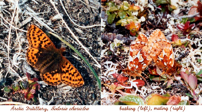 | There were a large number of these Arctic Fritillaries on the ridge to Black Tail Rocks at about 3000'. They flew close to the tundra floor, basking, nectaring, and mating. The sharply pointed central spot on the underwing makes the identification. Upper wing coloration is variable. They overwinter as larvae. Host plants include scrub willows and wild violets. Adults nectar on goldenrod and asters, among other flowers. I saw one nectaring on a blueberry flower. They range through much of Alaska and Canada, and further south along the Rocky Mountains. |