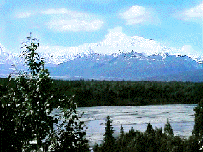 The Parks Highway parallels the path of the Nenana River which provides many beautiful vistas of its deep and winding valleys. |