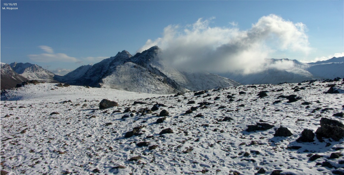 | Conditions have changed significantly since my last climb up Flattop. The beautiful autumn colors are gone. We are having a warm fall in the city, and temperatures were above freezing at the trailhead. However, part way up, snow, frost and ice appeared on the ground and vegetation. The final scramble to the summit was glazed with ice, and very scary. Seeing the snow up on top, I assumed it was cold up there and dressed accordingly, but many others were not wearing gloves or hats, and they looked pretty miserable. On the lower flanks, there were the usual assortment of magpies, chickadees, and red squirrels. Near the summit, a rock ptarmigan, dressed almost entirely in white, was probably startled by my dog. It took flight and found a new hiding spot in the boulders that are all around. |