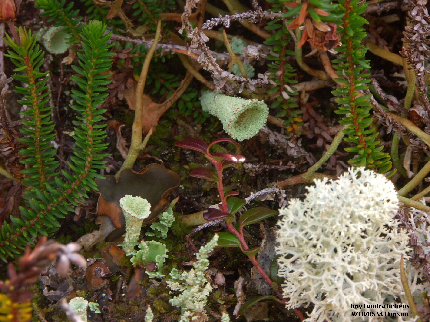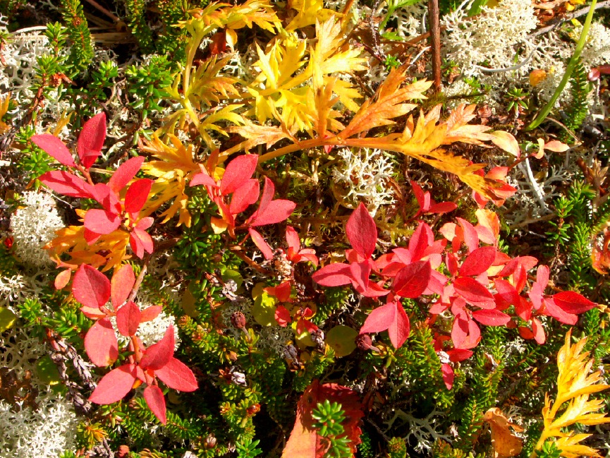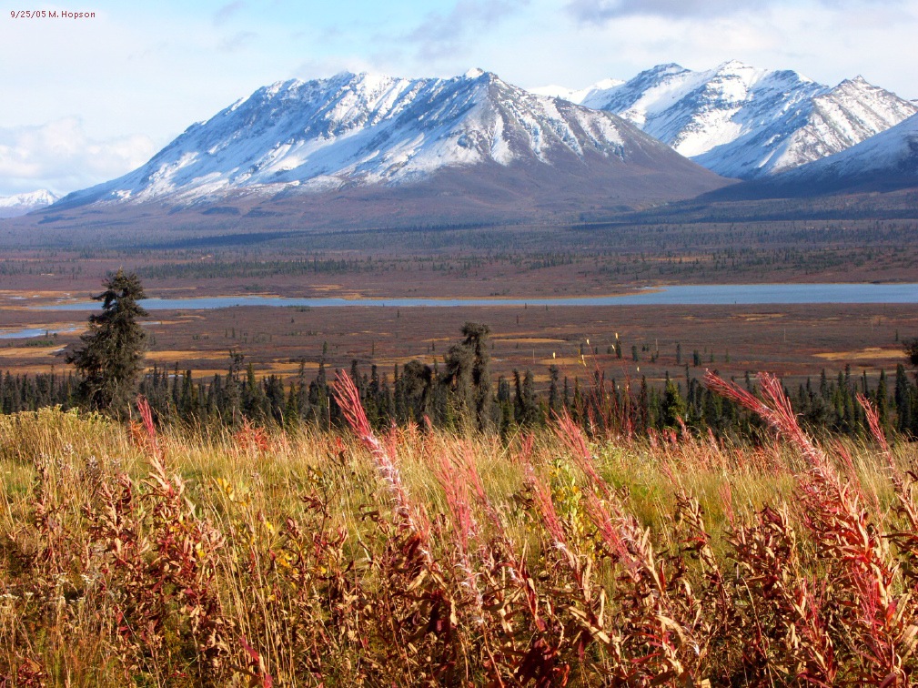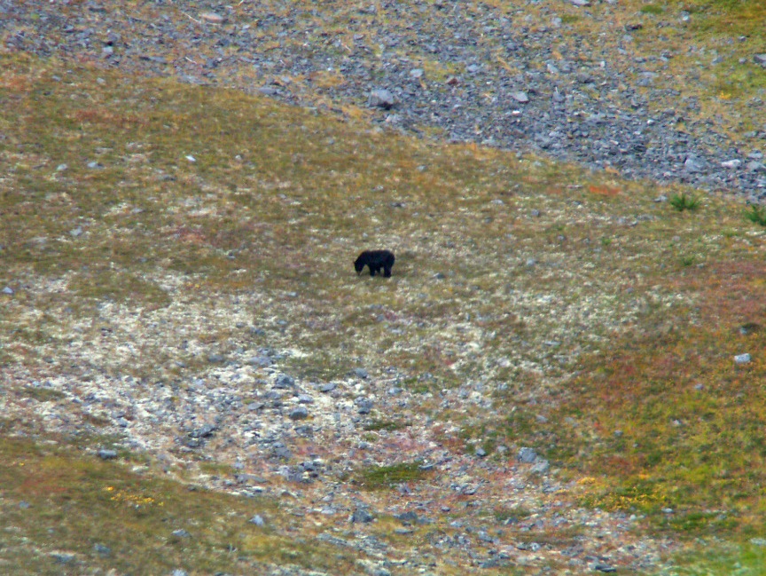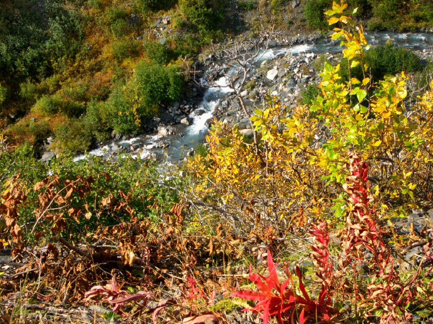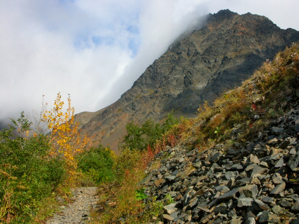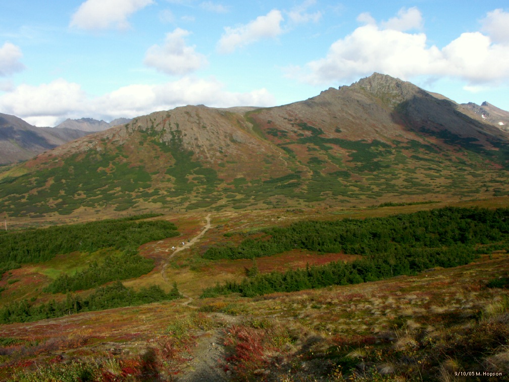 | 9/18/05 It's been a very wet fall, but Sunday wasn't too bad, with just some transient showers, and some patches of blue sky. I haven't been up the Crow Pass Trail before and was eager to see it. And I was not disappointed. It was beautiful. I even got to watch a bear, waaaaay down in the valley, foraging for berries. It was much too far away to get a decent picture, but I tried anyway. (Click to see the distant bear.) We hiked for a couple hours up the trail, to just a little beyond the first creek crossing, when some thicker gray clouds blew in and chased us back down. The trail is magnificent, and I'll definitely want to spend a day and go further, maybe next summer. |