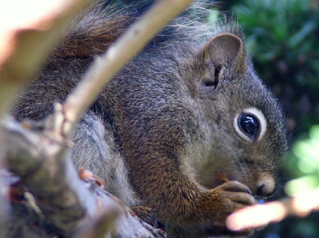 versions: There was a little red squirrel in a shady and secluded area of a hemlock tree, very close the the trail, not far from the trailhead. It seemed to feel very safe there, surrounded by the branches. It was eating something (cones?) from the tree. As it finished each one, it would scurry off to pick another, then return to the favored spot. As hikers came along, they would stop and watch the furry critter, amazed at its proximity and cavalier attitude. I was frustrated at all the branches in the way, and the poor lighting, but took this picture anyway: Little red squirrel, enjoying life along the Flattop Trail |