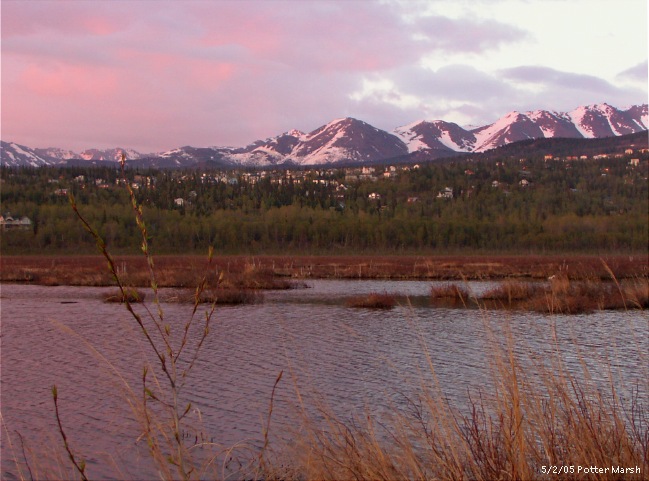 5/8/05 Anchorage has greened up in the past week, but snow remains in the mountains. The Flattop Mountain Trail was full of hikers enjoying the sun and snow. Much of the trail was clear, with only a few sections missing under the snow pack. The scramble to the summit was a bit difficult going up, and harrowing going down, but it's not very long. You take it slow, moving one hand or one foot at a time, and all is well. Many hikers opted not to take the summit (probably wisely), but it was gorgeous up there, worth a few scary moments. The snowfree areas are mostly brown and lifeless, but a closer look reveals signs of spring in small tundra plants. Several species were budding, and one small clump of anemones were in full bloom. There were several Milberts Tortoisehell Butterflies flying, too. We couldn't ask for a more beautiful Mothers' Day. |
