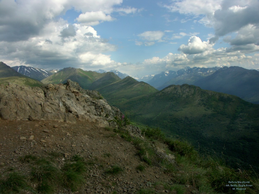7/7/05 Mt. Baldy, out in Eagle River, about 10 miles from Anchorage, is a popular place to climb. It's a fairly short, but steep ascent, which gives hikers a good workout. After scaling the west side, a beautiful broad ridge stretches out for a couple more miles to the east. It's like a reward for having worked so hard to get there. So Jascha and I went down to the meadow-like ridge and walked for awhile. He was delighted to watch several arctic ground squirrels (who were not at all glad to see him). I was looking for flowers and butterflies. As we moseyed along the ridge, I noticed that the clouds were building up and darkening. Thunder storms used to be very rare in this area, but the recent warming of the ocean water has changed weather patterns here. For the past few summers, electric storms have become increasingly common. So we didn't finish the ridge, but walked back up over the summit and down the west side to the parking area. Rolling thunder accompanied the descent. The rain politely held off until we were inside the van. Click the upper right photo to see a full screen version of the view over the west side of Mt. Baldy |