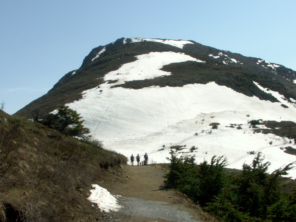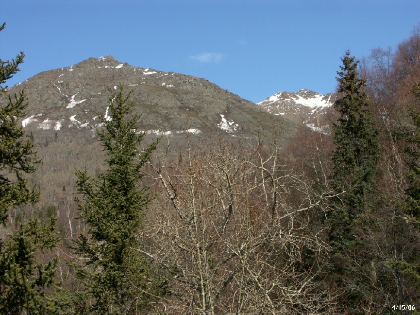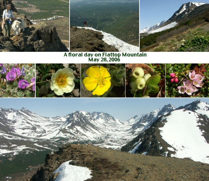 | 5/28/06 Fearful of avalanches, I waited until most of the snow was off my favorite mountain. Although there were long stretches of trail that were snow covered, all the dangerous packs that sometimes cling below the summit were gone. It was a beautiful climb on a sunny day. From a distance, the mountain doesn't appear green or colorful yet, but a closer look revealed hundreds of tiny tundra flowers at the summit and all along the way, above the treeline. Part of the scramble below the summit was packed with snow, making that difficult section particularly frightening, but we made it safely up and down. The weather lately has been perfect, with temperatures in the high 60's or low 70's. Rain has come conveniently in time to damp down wildfires, and water our gardens. During times like this, I am convinced that Alaska is a paradise. |