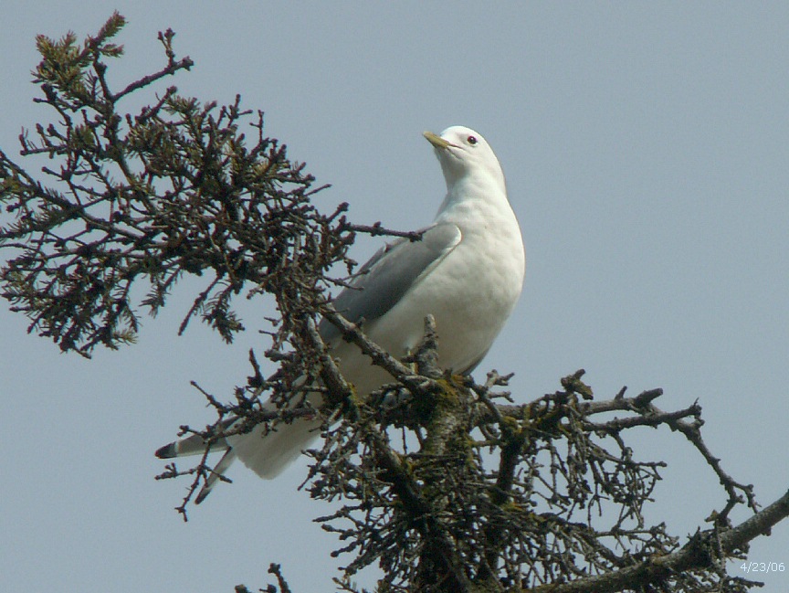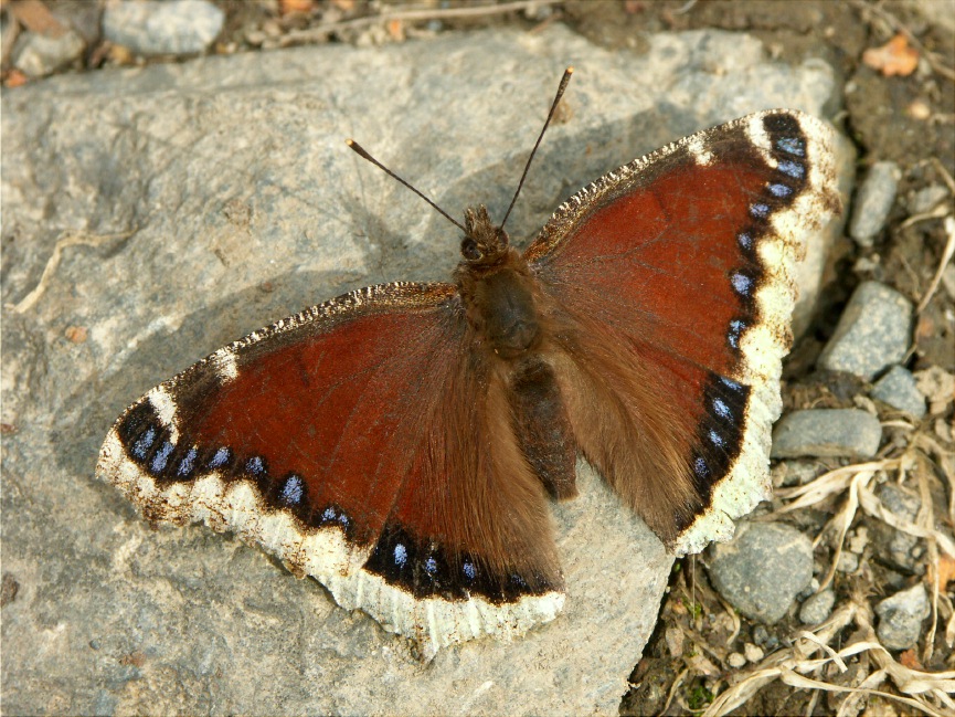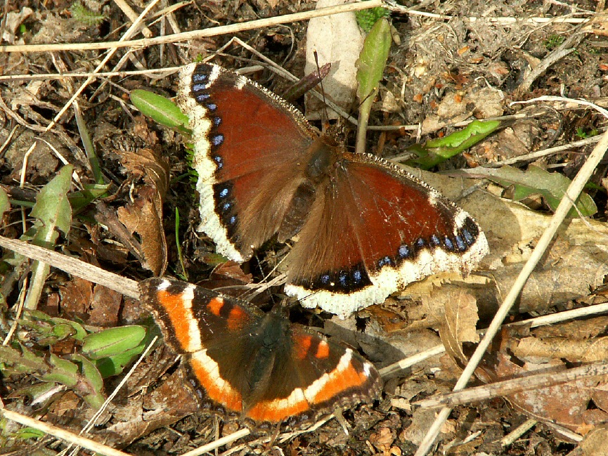 | 4/23/06 The trail up Bird Ridge usually clears of snow first, because of the steep southern exposure and high winds in the area. When Saturday dawned calm and sunny, I wondered if the Bird Ridge Trail was ready for hiking. After driving the 25 miles to the trailhead, I discovered that many others had the same thought. The parking lot was full, and cars were lined up along the shoulder of the highway. The trail was relatively good until I reached the snowpack a little way above the "meadow", beyond the treeline. We turned back at that point. The "meadow" will be covered in flowers soon, but nothing is blooming yet (other than willows). That did not discourage the Milbert's Tortoiseshell Butterflies. They hibernate in the adult form and start to fly, even with snow all around, if their body temperature reaches about 50ºF. I saw 5 or 6 of these amazingly hardy critters, and was able to photograph one. There were eagles soaring over the valley, circling. I heard ptarmigan too, but never saw them. The next day, there were snow flurries in Anchorage, but I'm not fooled by that; Spring is really here now. |