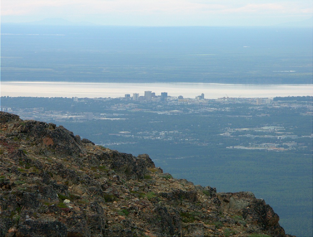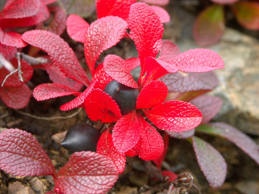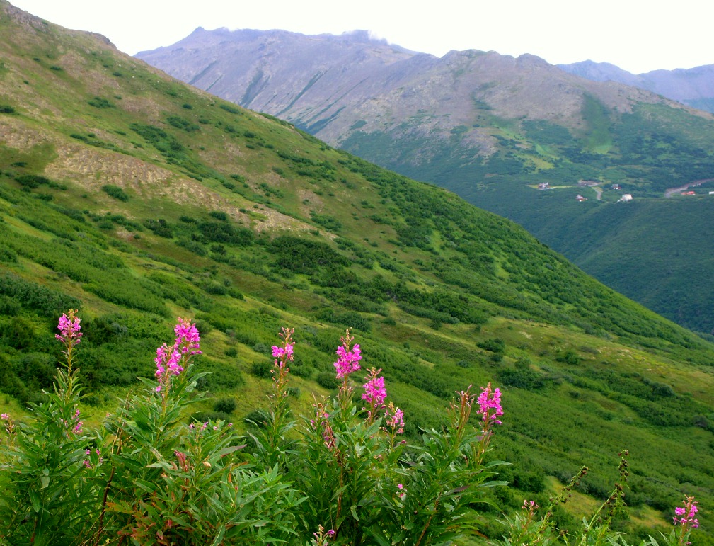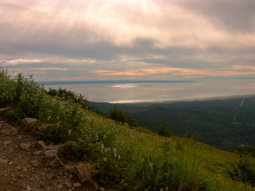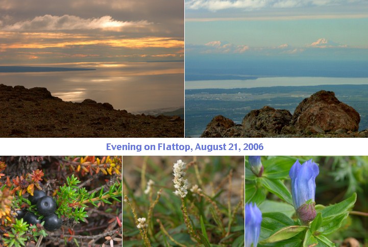 | 8/21/06 Twelve straight days of rain. One nice day was predicted, with rain returning the next. You can't miss an opportunity like that, so after work I ran home and asked Jascha if he wanted to climb Flattop. He said yes. He always does. Every trail in the area was full of happy people Monday night, and Flattop was no exception. We were rewarded with views of Mt. McKinley 100 miles to the north. A surprising number and variety of flowers were still out, and now berries are everywhere, too. The bearberry leaves are turning red, suggesting just a hint of autumn. Rain returned the next day, as predicted, but that couldn't diminish the memory of a beautiful evening on Flattop Mountain. |