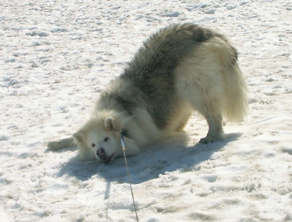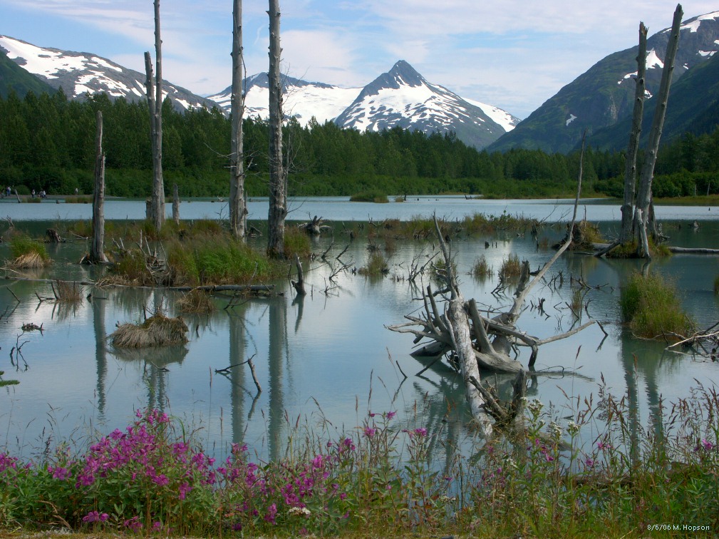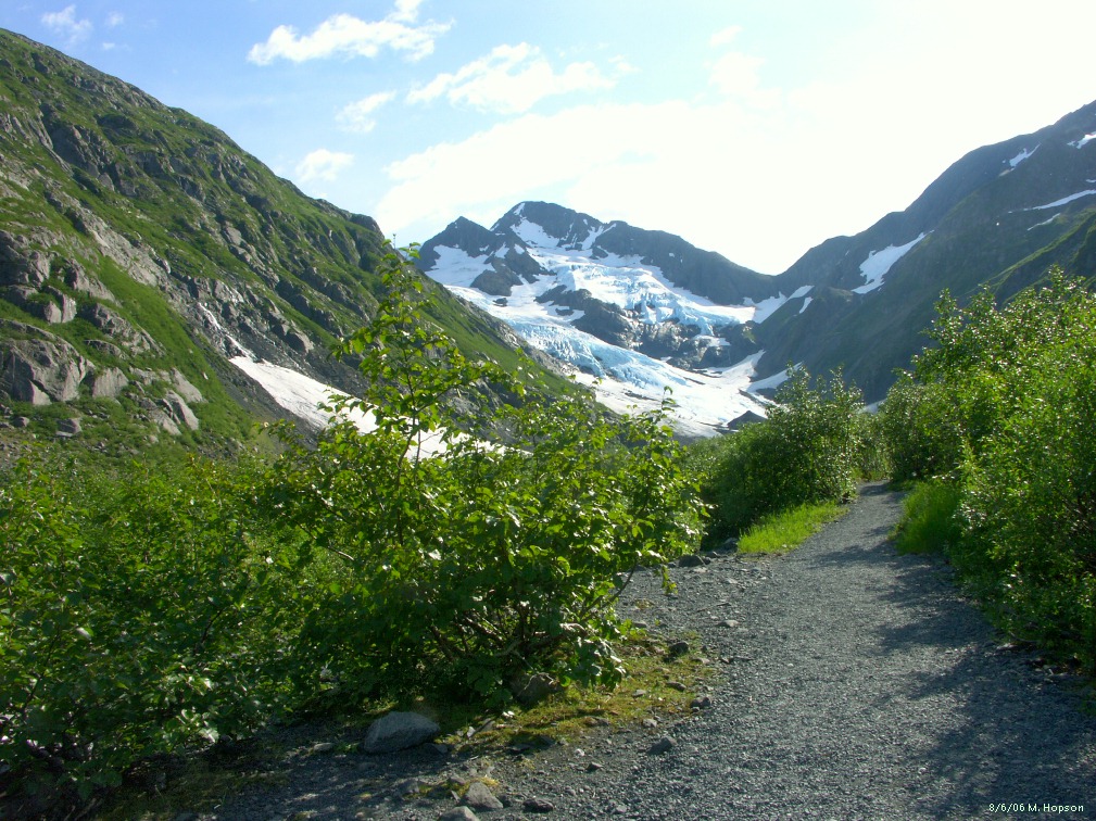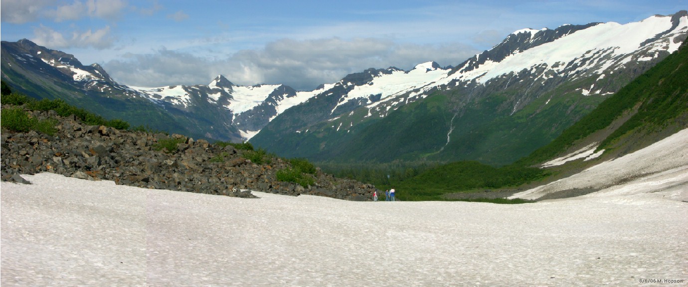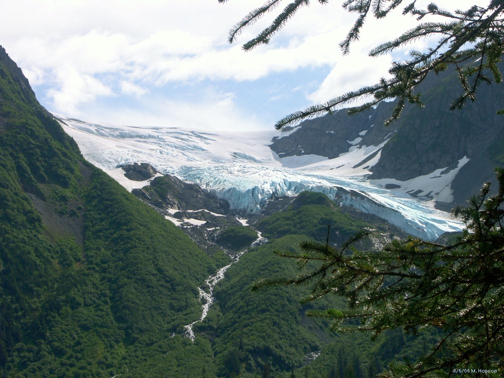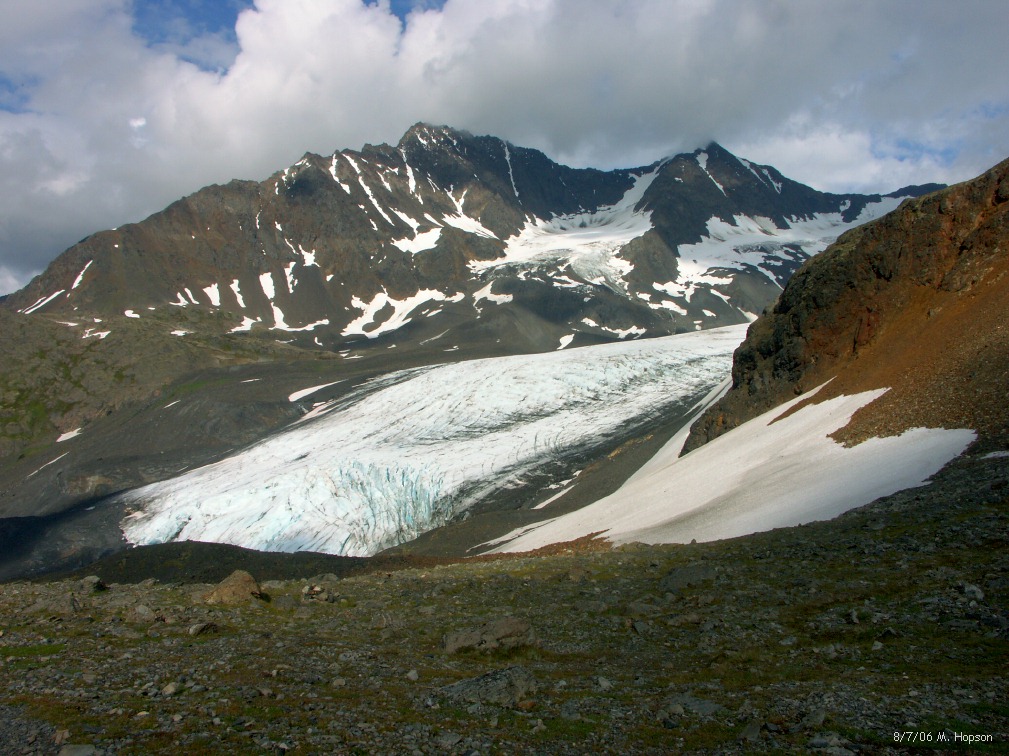 | 8/6/06 Sunshine! And it's expected to continue for two more days! Must enjoy every second! Last summer, when I visited Byron Glacier, the snowfield had shrunken alarmingly, but this year it came back, at least enough to cross the valley again. There was a lot of snow in this area during the winter, and cold temperatures too, which apparently was enough to build up the snowfield. However, the glacier behind it is still retreating. We walked across the snow to the boulder field. Jascha had a great time romping in the snow. Click the photos for full-screen versions. |