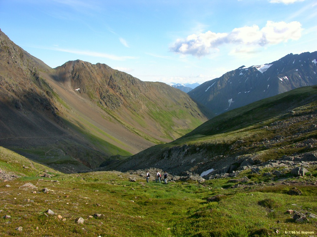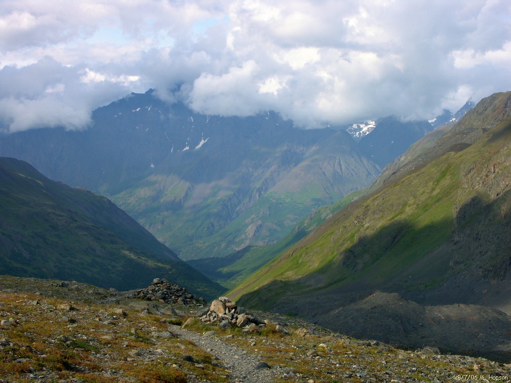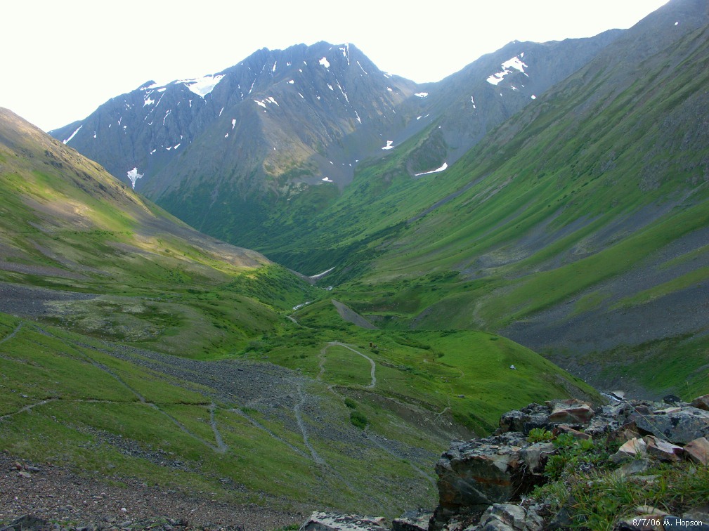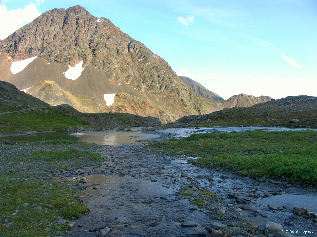 | 8/7/06 The last time I climbed up the Crow Pass Trail, scary black clouds and wind rolled over the mountains just before the Pass, and I turned back. The weather was much more cooperative this time, with a light breeze and some clouds moving across the sky. I made it to the top of the Pass, past the cabin, through the second creek crossing, and finally stood before Raven Glacier. Someday it would be fun to go down the other side. Arctic Ground Squirrels tormented my dog most of the way, chirping at him, then vanishing down a hole. I enjoyed watching a little bird, an American Dipper, foraging for tidbits in a rushing stream high in the pass. It could walk under the water, clinging to rocks, while it gathered tasty morsels. There were flowers of all colors to brighten up the trail. It was a perfect summer day, in a beautiful location. Click on 'em, and see 'em bigger. |