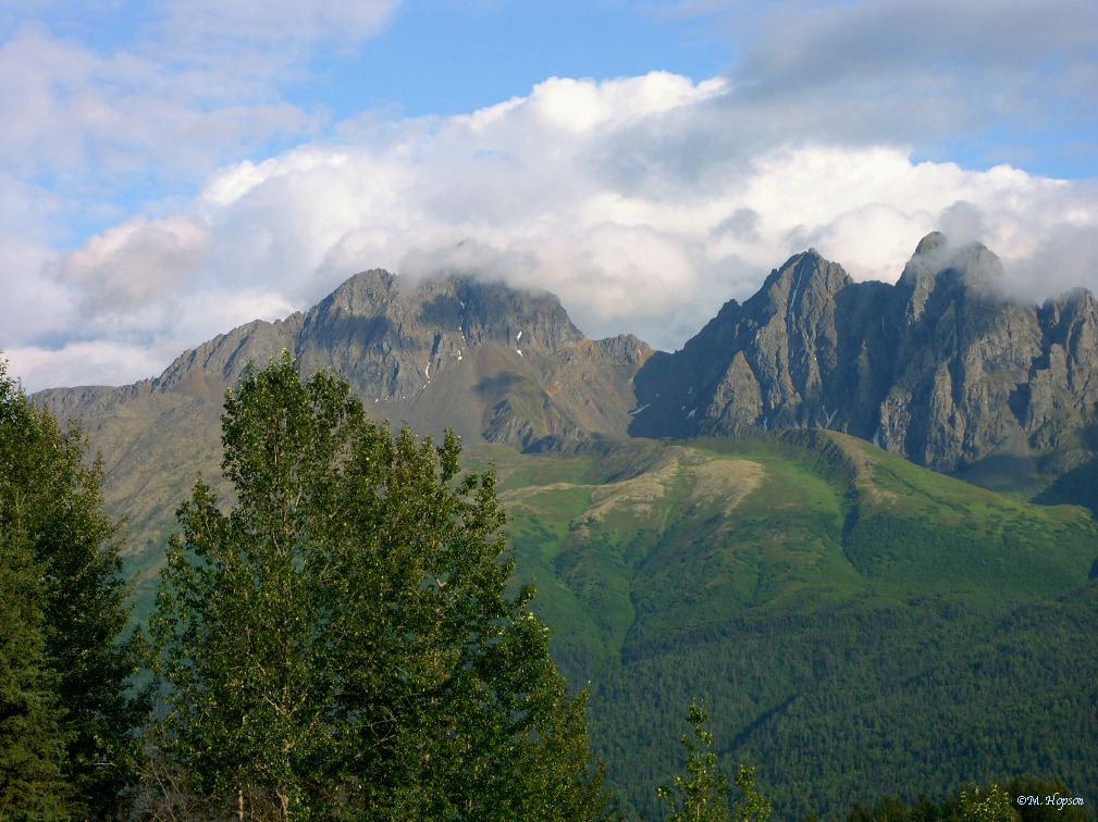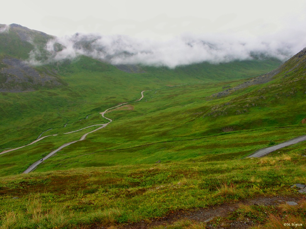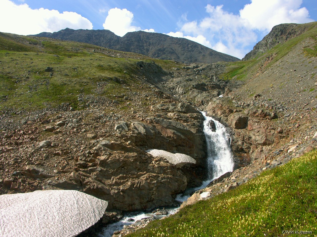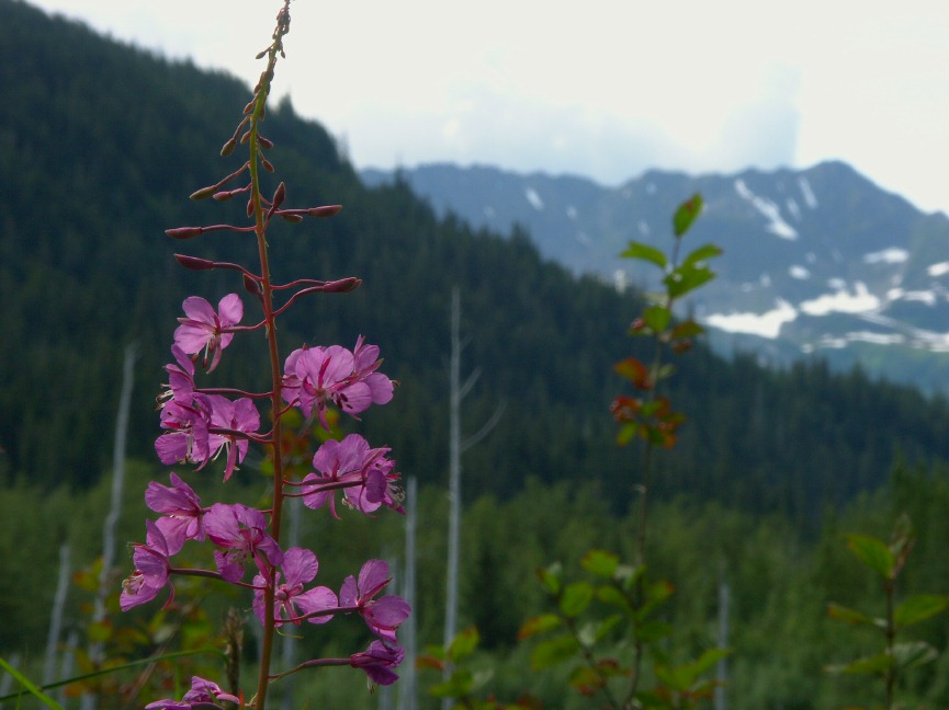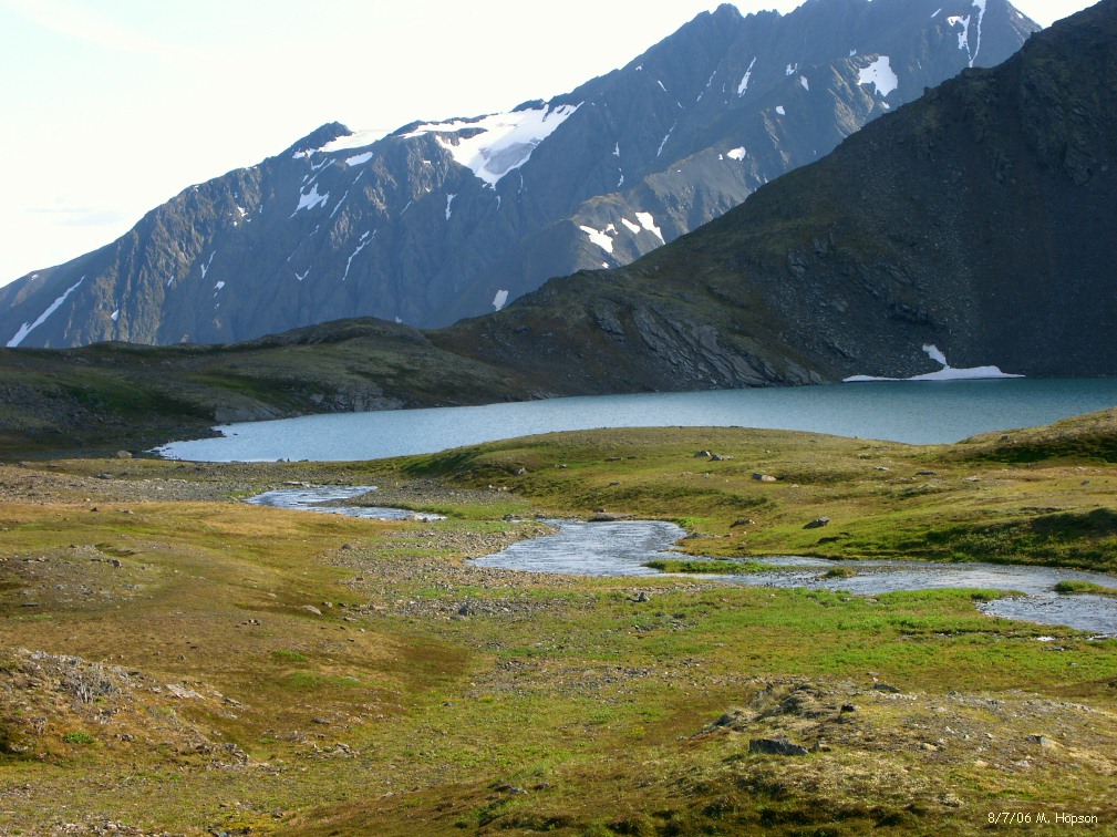 | 8/7/06 The last time I climbed up the Crow Pass Trail, scary black clouds and wind rolled over the mountains just before the Pass, and I turned back. The weather was much more cooperative this time, with a light breeze and some clouds moving across the sky. I made it to the top of the Pass, past the cabin, through the second creek crossing, and finally stood before Raven Glacier. Someday it would be fun to go down the other side. Arctic Ground Squirrels tormented my dog most of the way, chirping at him, then vanishing down a hole. I enjoyed watching a little bird, an American Dipper, foraging for tidbits in a rushing stream high in the pass. It could walk under the water, clinging to rocks, while it gathered tasty morsels. There were flowers of all colors to brighten up the trail. It was a perfect summer day, in a beautiful location. Click on 'em, and see 'em bigger. |