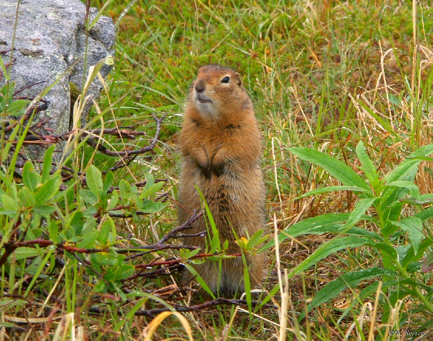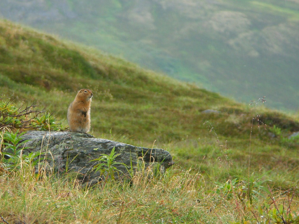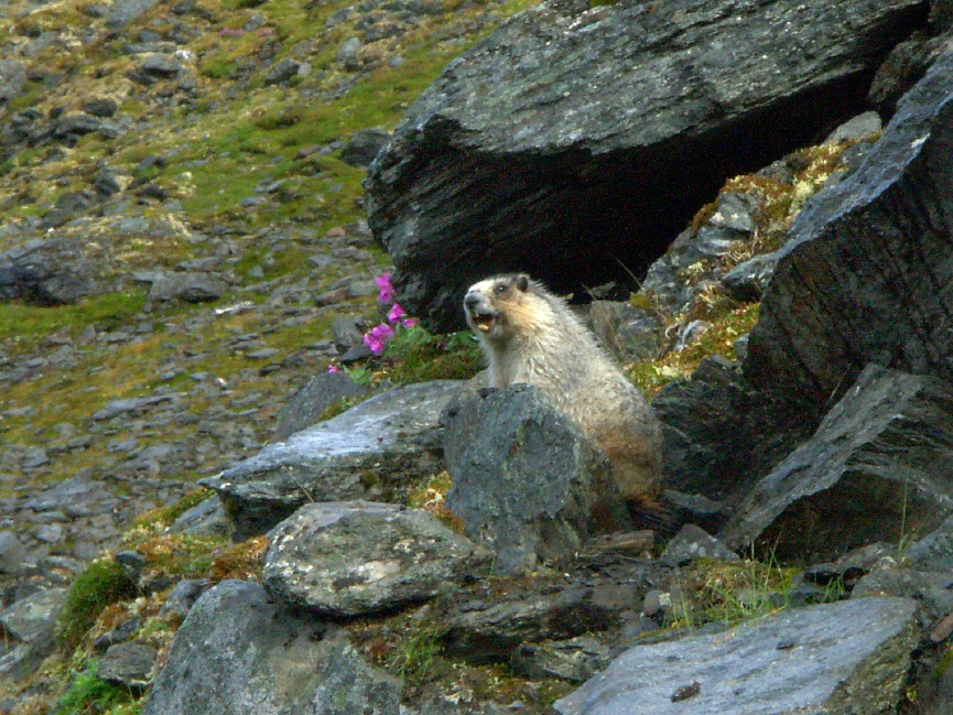 | 8/5/06 Another drizzly day. Sun is supposed to be on the way, but I can't wait. So I drove out about 40 miles and hiked around several places in Hatcher Pass, including the footpath around Summit Lake. It rained lightly the whole time. Hiking in high country, I often hear Hoary Marmots, also known as "whistle pigs" for their long, high-pitched calls of alarm. Sometimes I'll see one scurry off in the distance. Today is the first time I was able to get close enough to take a photograph. There were also little Arctic Ground Squirrels all over the place. All the rodents looks rather damp today. Clicking on the small photos will produce a bigger one. |