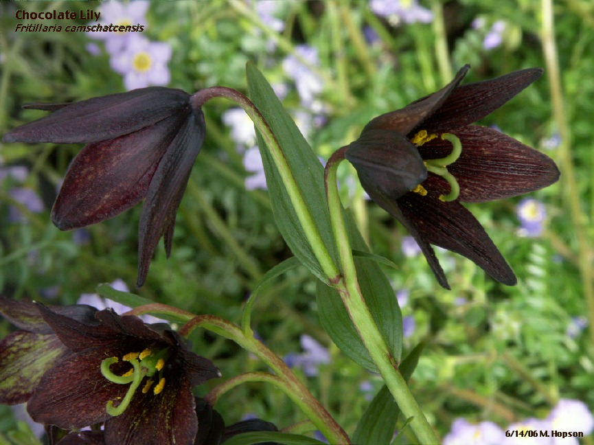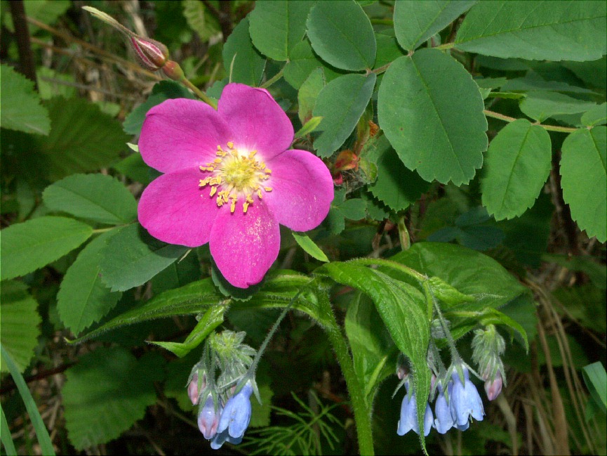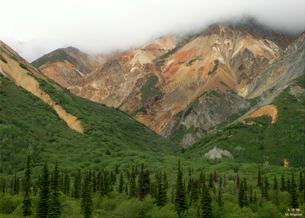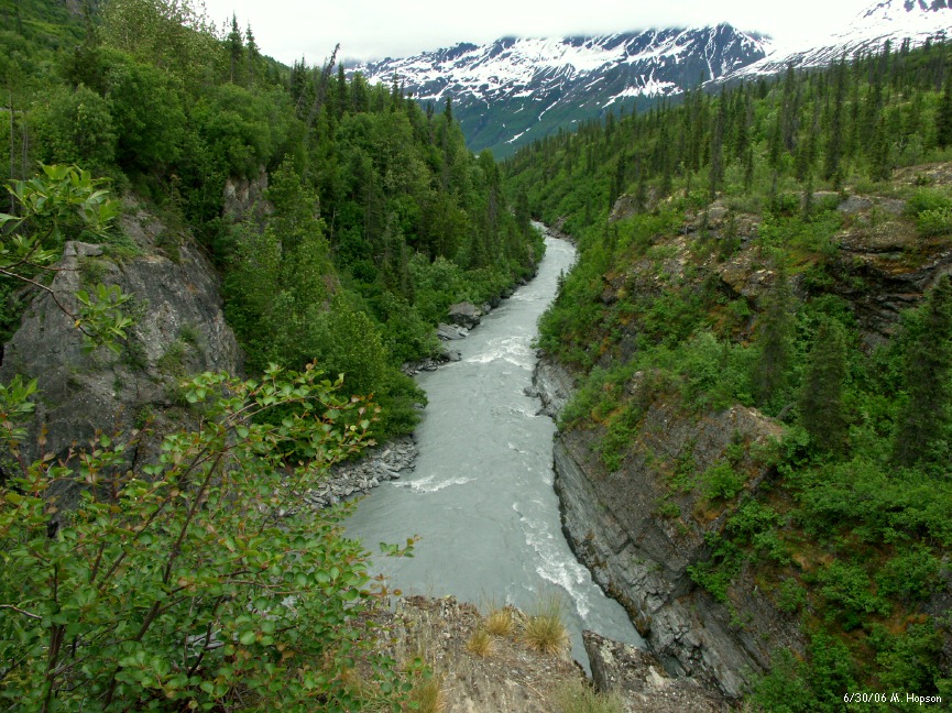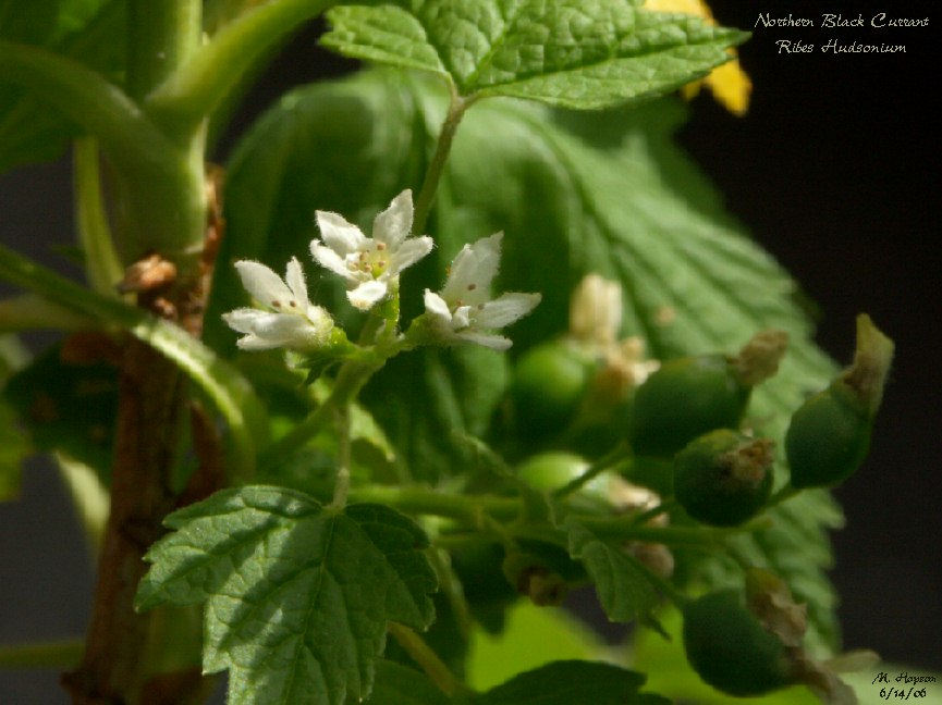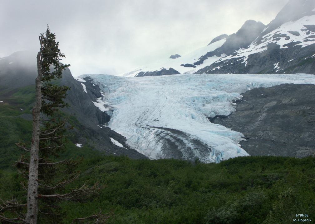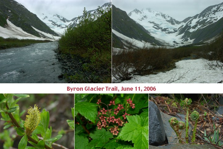 | 6/11/06 After a couple weeks of perfect weather, clouds, wind, and drizzles have completely taken over. Unable to depend on getting decent weather for several hours, I can only go out on short hikes. The Byron Glacier Trail fills that bill. It's still early spring in that glacier filled area, and some red currants were the only flowering plant I found. Fiddlehead ferns were popping up all over, and some had uncoiled. Parts of the trail were still under snow. |