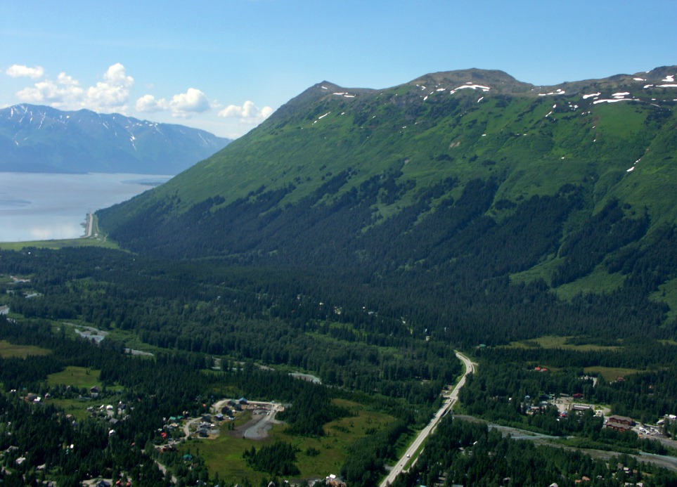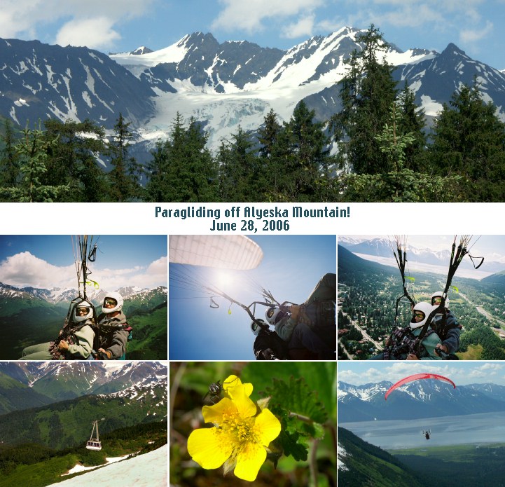 | 6/28/06 Now here's something different! This time I took a tram up Alyeska Mountain, then ran off a cliff. On purpose! It's called paragliding, and it's different from skydiving or hang-gliding. Immediately after the tram ride, I watched a solo paraglider fly off the cliff (photo, lower right). The tandem paragliding rides are for the untrained, such as I. After I made the call, we had to wait several days for a favorable break in the weather. Then the winds started to spring up during my ride, and the guys thought they might have to close down for the rest of the day. It was terrifying, but fun. The pilot, Brian, took the photos of us flying, using a small camera on a long pole. We landed in a soft, soggy bog, that was full of Caltha-leaf Avens. Alyeska is a ski resort in the winter. Some of these photos have large links if you click on them. |
