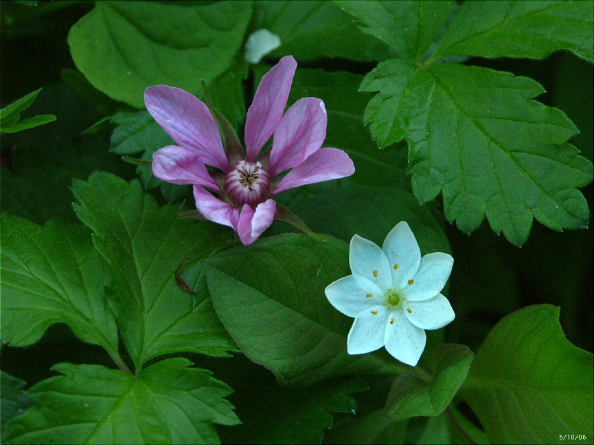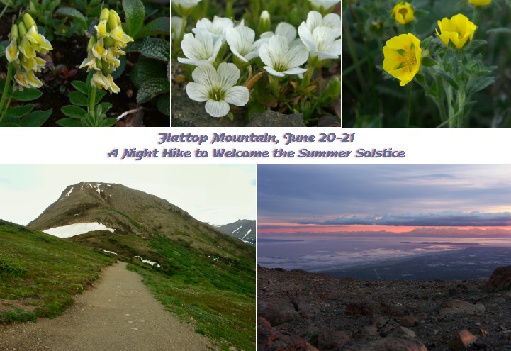 | 6/20-21/06 With Wednesday being the first day of summer, throngs will hike up Flattop that day (weather permitting). However, I decided to go up Tuesday night and see the sun go down on the last day of spring. There were very few people along the trail, partially because of bad weather in the city. As a general rule, wind and rain will be worse in the mountains. As I looked at the mountains from my house, it appeared that conditions were actually better there. I took a chance, and was rewarded with a delightful climb. I was still on the mountain after midnight to welcome in the first day of summer. (I believe the official Solstice occured at around 4AM, when I was snug in bed.) The sun set after 11:40PM and sky was still light enough to see clearly to climb down the mountainside. Birds were still singing after midnight. There was a different batch of flowers up there this time. All the photos in the collage have links to large versions if you click on them. |