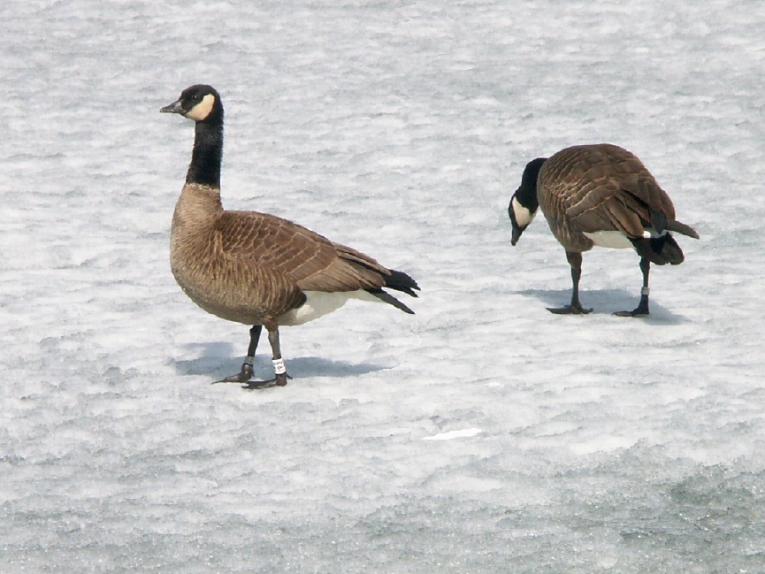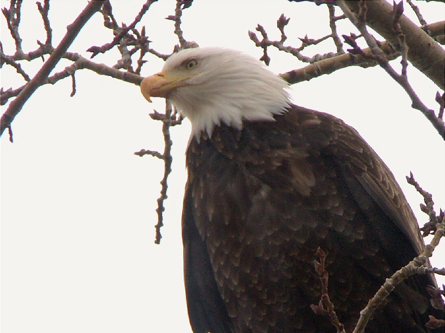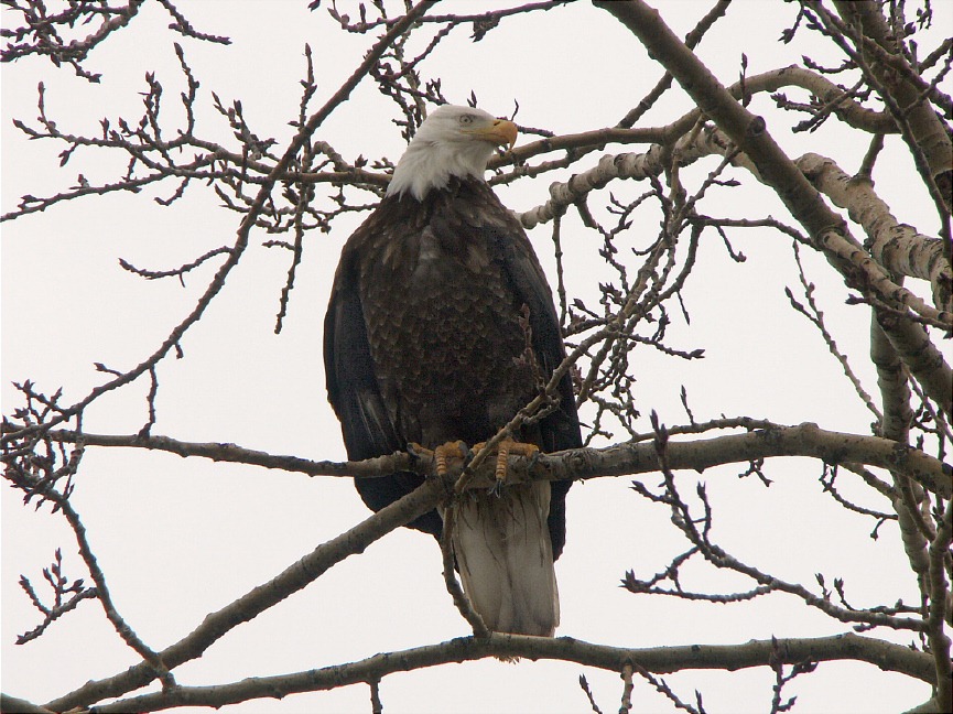 Bird Pix: Scene with the Bald Eagle high in a tree Zoom view of the eagle's back Front view of the same eagle Closeup of the eagle's head Canada Geese on a frozen lake The ducks find some open water A Black-capped Chickadee in the willows