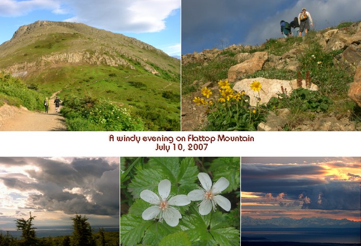 | 7/10/07 After another gray day, clouds seemed to part over the mountains, making them very enticing. Although there were gusty winds along the way, sometimes slowing progress, the mountain remained bathed in sunshine. Looking down toward the Anchorage "Bowl", we could see an ominous cloud covering the entire area. Upon cresting the summit edge, hikers immediate encountered powerful steady wind, perhaps 45-50 mph. Everyone huddled behind rocky windbreaks for respite before retreating back down the trail. Shortly after we returned to the trailhead, there was a beautiful sunset. Click any of the little pix, and the links below, for full screen images. |
