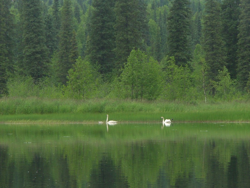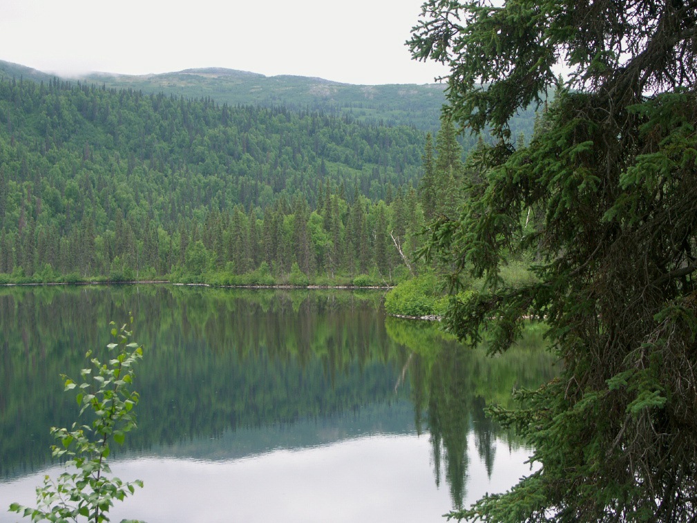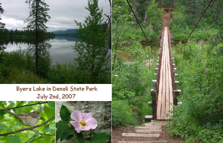 | 7/2/07 With the new month, there's been a change in the weather, and it looks like it's here to stay for awhile-- heavy overcast with intermittent drizzle. I was hoping conditions might be better further north, so I took a trip up the Parks Highway. The clouds followed us. Friends had told me that there were beautiful views of Mt. McKinley from Byers Lake, but, of course, that was not the case today. Nevertheless, the 5-mile hike around the lake is a pleasant stroll through a forest, with nice glimpses of the lake interspersed. There was an assortment of birds and flowers along the way. My dog found the swaying foot bridge to be a bit disconcerting, but he bravely crossed it anyway. All the small photos below have larger versions online if you click on them; there are additional links below the collage. |