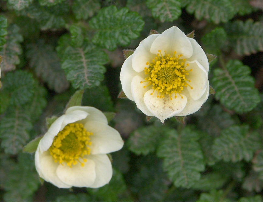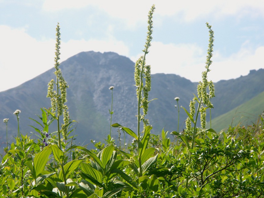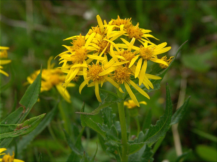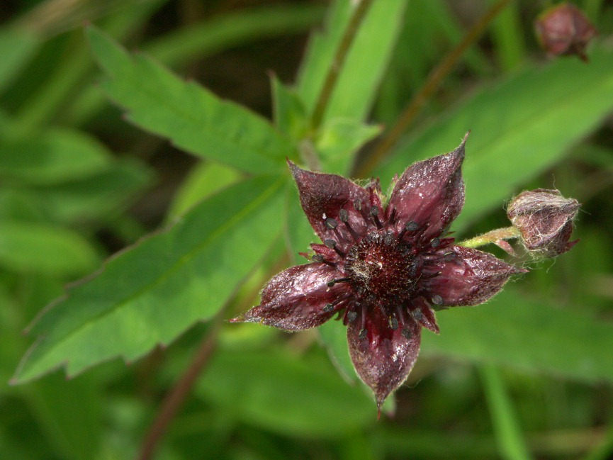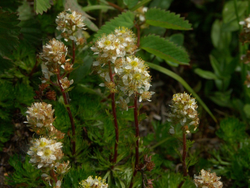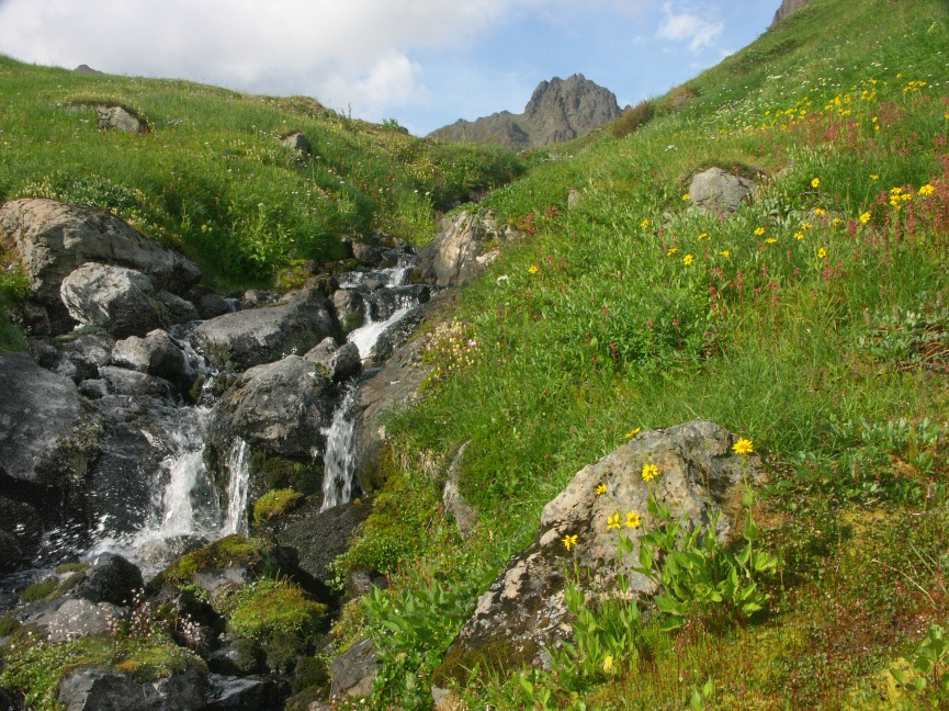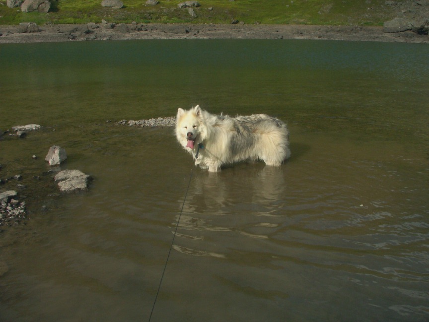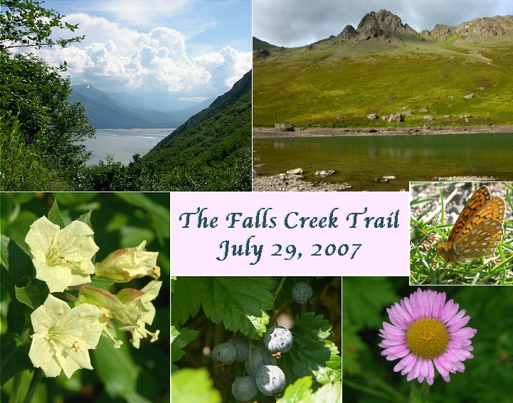 | 7/21/07 The Falls Creek Trail 20 miles down the Seward Highway is, by turns, overgrown with pushki and devil's club, rocky, dusty, muddy, steep, and confusing. In fact, I've tried twice before to find the way to the headwater lake at the end of the trail, and failed both times. This time I managed to find it, although I was completely off the trail, just following the creek, for quite awhile. I felt sure the creek would lead me to the lake, even though the footpaths were unreliable. It was wonderful up by the tarn, surrounded by alpine tundra and rocky peaks. The biting black flies that plagued us along much of the trail were absent at the higher elevation. Jascha enjoyed his romp in the cold water. We sat up there enjoying the view and eating a nice snack until some clouds gathered over the mountain range and thunder began to rumble. Then we left the beauty of the tundra and plunged back into the dense vegetation. It was a treat to see the Yellow Willow-herb flowers (Epilobium luteum) in a very wet subalpine meadow; I'd never seen any before, and there was a great profusion of them there. |