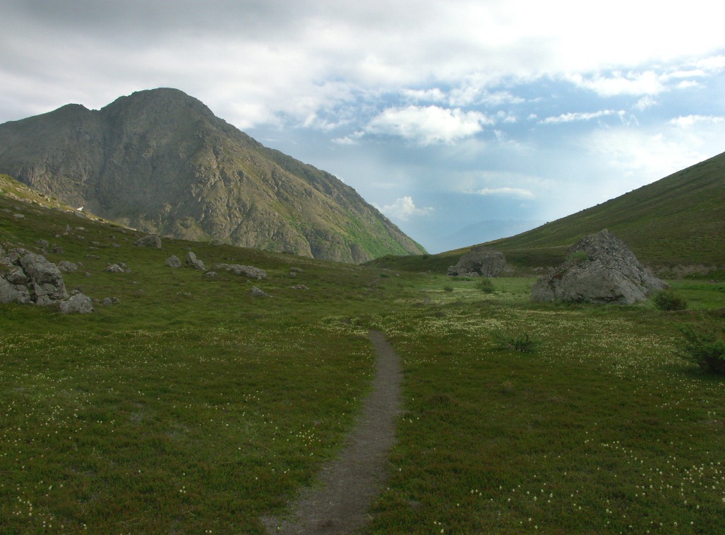 | 7/21/07 Wow, what a great hike! It was a beautiful day in Hatcher Pass, and there's never a shortage of mountains to climb there. We haven't been up the Fishhook Trail before, so we packed plenty of water and scrambled on up. The views are always great there, because the entire hike is in alpine tundra, with no trees to block the scene. There was an abundance of flowers, a couple species of butterflies, and the everpresent arctic ground squirrels along the way. We watched paragliders flying off nearby ledges, floating into the valley below us. We stayed up on the ridge for a long time, reluctant to leave such a perfect place. There was quite a bit of overcast, but no rain until we were nearly back to the trailhead. As we drove the 50 miles back to Anchorage, it rained a bit. The next day there was a steady downpour. |