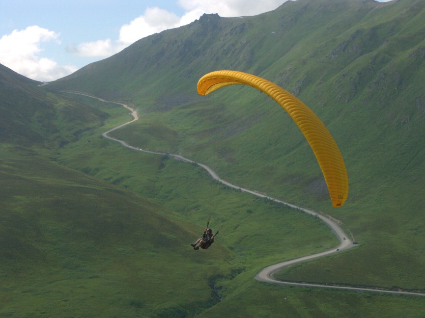 More photos from the Fishhook Trail: A paraglider floats through the valley |