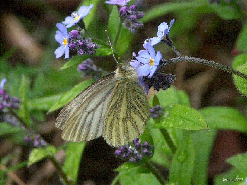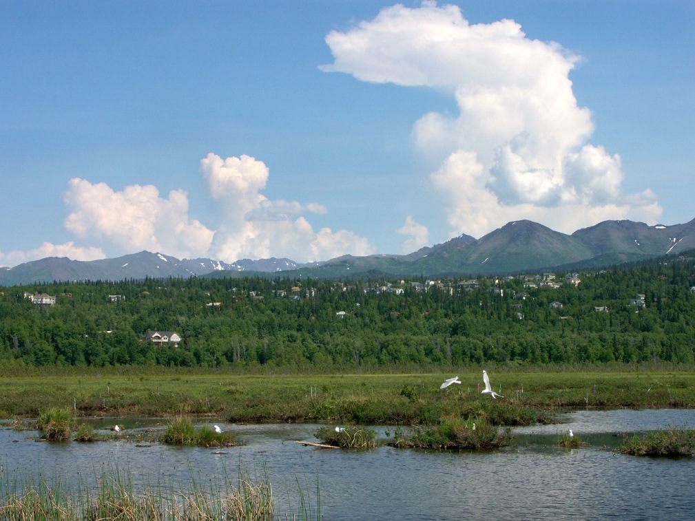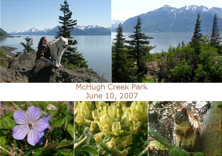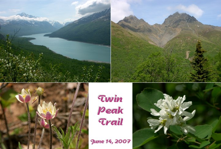 | June 14, 2007 Flag Day! And a perfect day for a hike up the Twin Peaks Trail, by Eklutna Lake. It's about 25 miles from Anchorage, and a friend of mine lives out that way. She was on a tight schedule, so we went to the overlook and a little beyond, but didn't have time to go to the end of the trail. There were several species of butterflies up there, but once again, not one would sit still for a portrait. Moose and bear were spotted on this trail, too, but we didn't see them, and our dogs didn't alert to anything. We did startle a willow ptarmigan (Alaska's State Bird) which flew off into thick forest. Click the small pix for big versions. |
