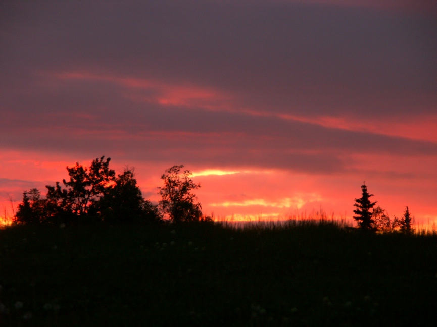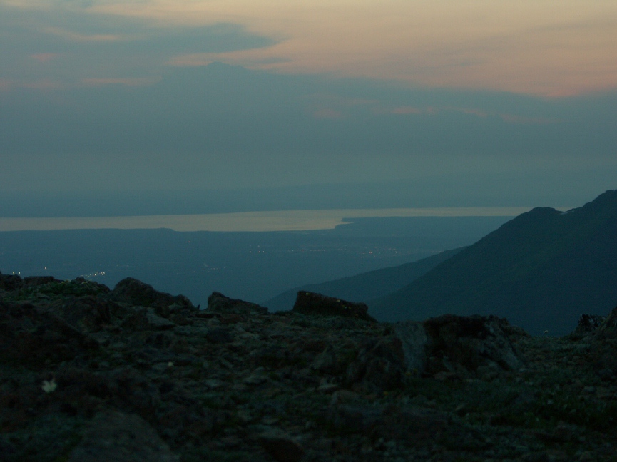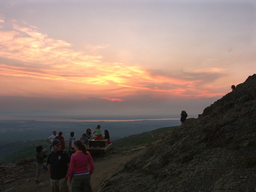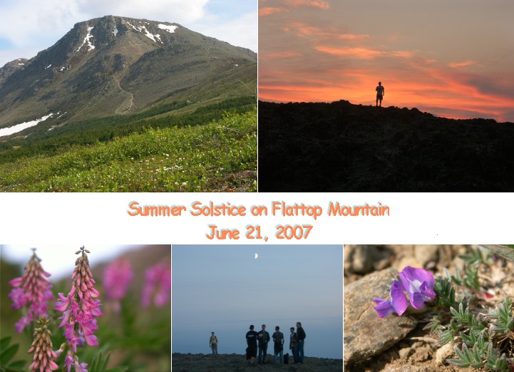 | 6/21/07 Summer Solstice is always the most popular day of the year to climb Flattop Mountain, and this year the weather cooperated. Planning to be on the summit by midnight, I started up the trail at about 10:30PM. There was enough light then to photograph some of the flowers along the way. After the 11:42PM sunset, dusk settled over the mountain. I arrived at the summit close to midnight, and spent a pleasant bit of time walking around, trying to capture some of the low light scenes there. Around the Solstice, you can see well enough to walk around all night long. So it was still safe to hike back down after midnight. There are a couple midnight scenes in the links below the collage, and most of the small photos also have links to full screen views. |