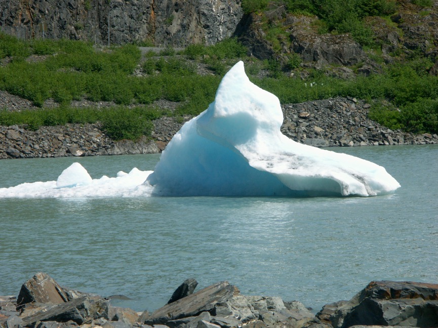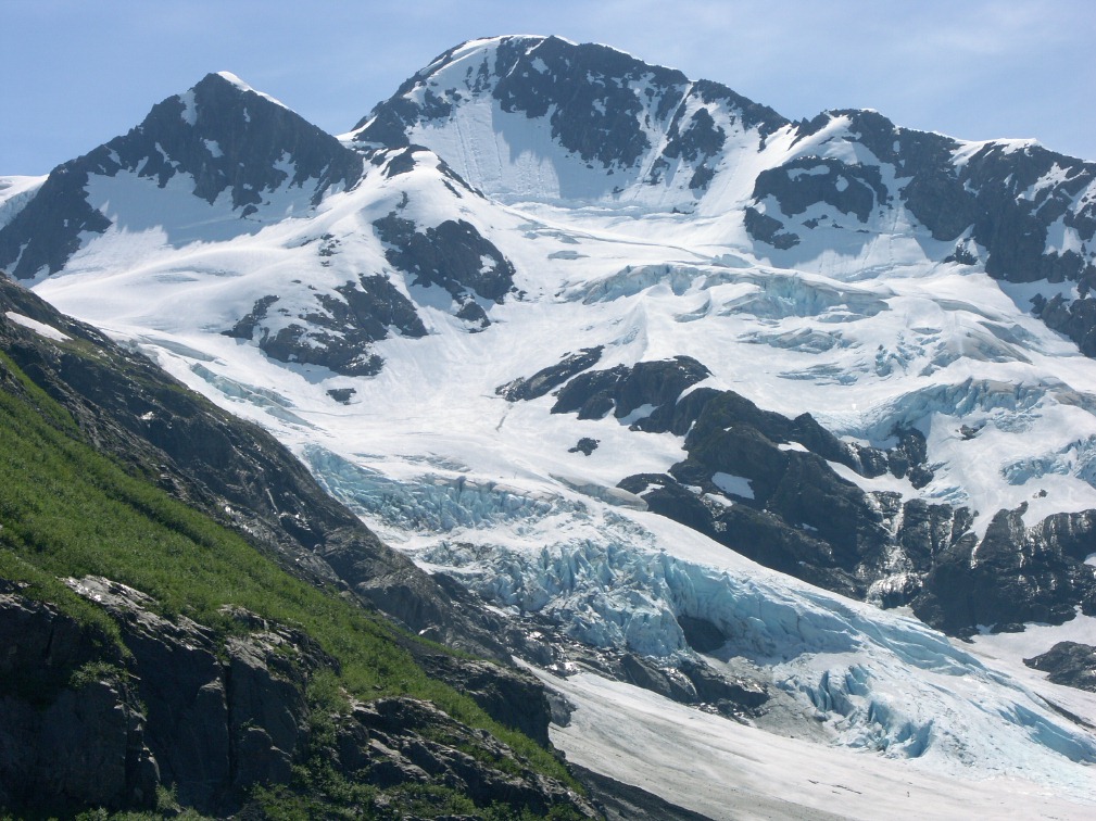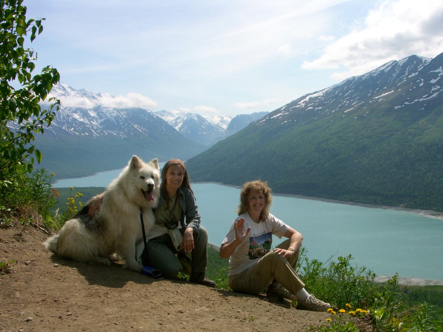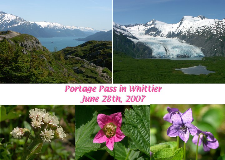 | 6/28/07 Our near perfect summer weather continues. Although it was very windy in Portage Pass today, the sun was shining, with moderate temperatures. It's a stunningly beautiful place. After a short, steep climb through a forest, hikers are rewarded with views of rocky tundra, the Passage Canal by Whittier, and glaciers everywhere you look. There are glacier fed ponds for a thirsty dog. And flowers, flowers, flowers... . After this hike early in the day, we explored the fishermen's wharf in Whittier, and enjoyed a halibut lunch there. (Yes, I shared a bit with Jascha.) Then I drove back through the two-mile long tunnel that goes under Maynard Mountain, and hiked the Byron Glacier Trail on that side. The collage pix have larger link if you click them. As usual, additional photos have links below the collage. |