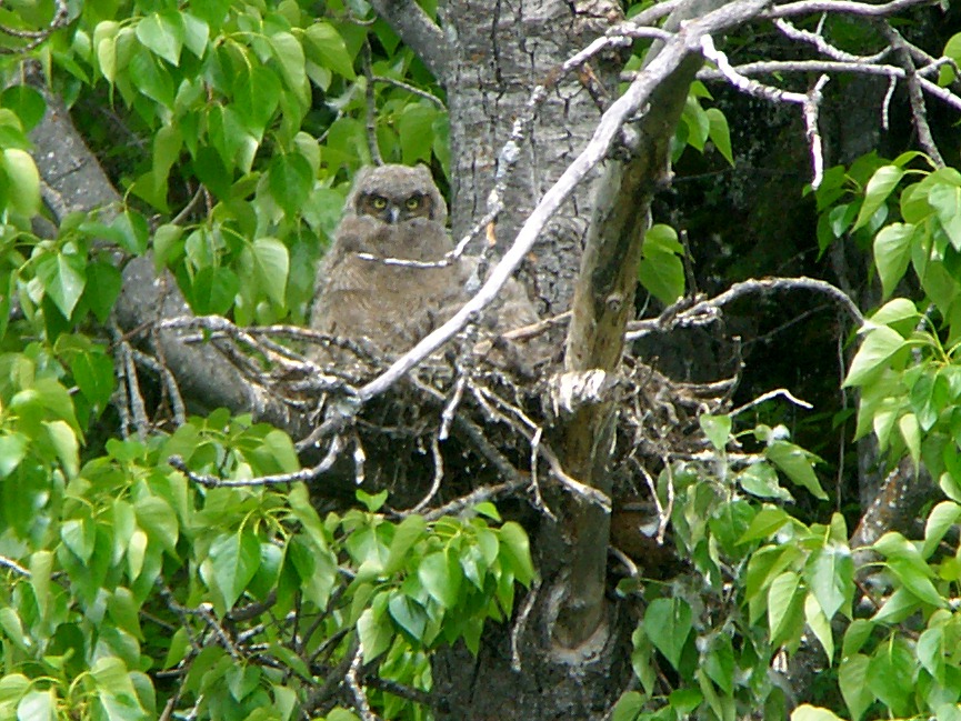 More photos from early June: Two baby Great Horned Owls, in a distant nest |