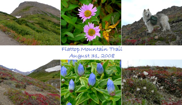 | 8/31/08 Any day with just a hint of clearing is appreciated this summer. It's another gray day, but without much rain, so good enough to check out what's going on along the Flattop Mountain Trail. Autumn is arriving up there with red bearberry foliage tinting the slopes. There were a variety of berries up there, and the crowberries were especially delicious. The snow on the north side never fully melted, and new snow will be arriving soon. Click on the thumbnails for full-screen versions of the photos. |