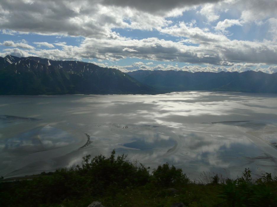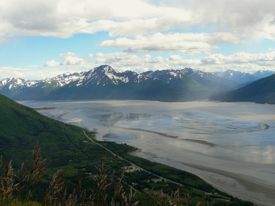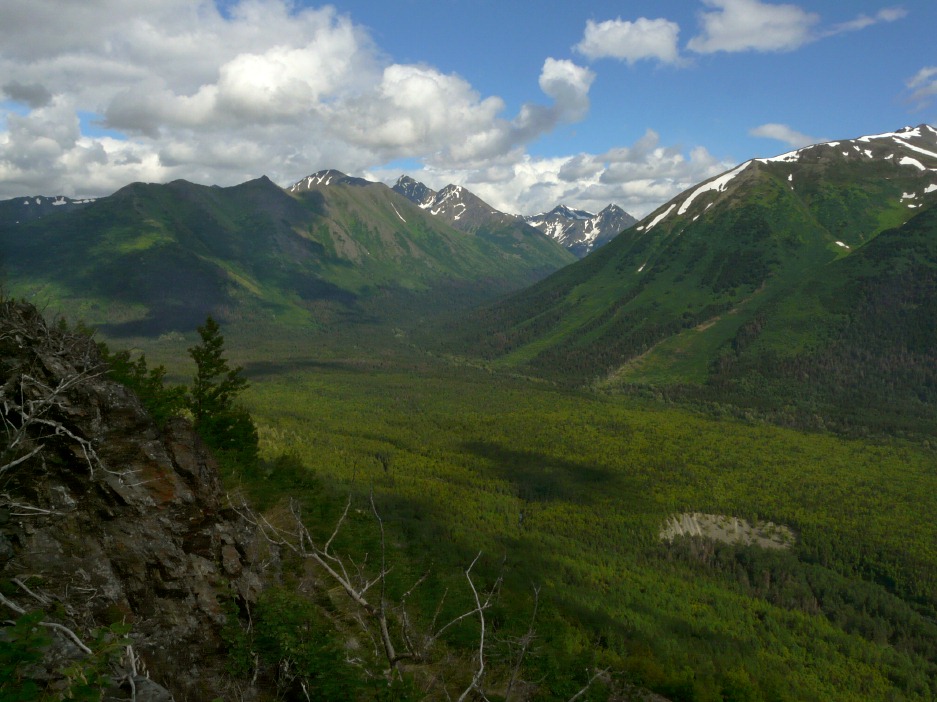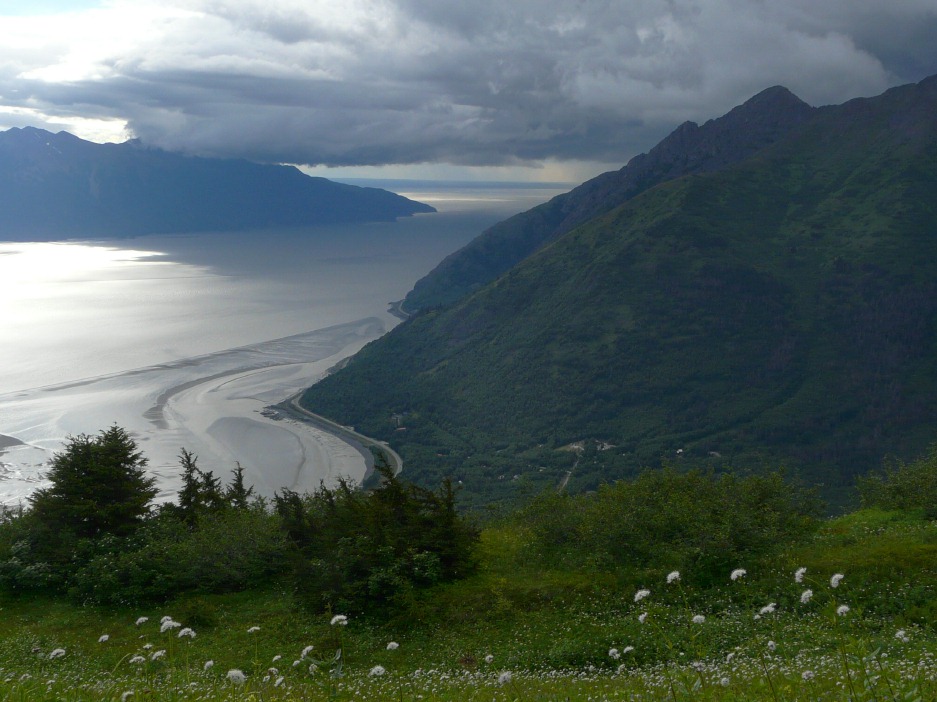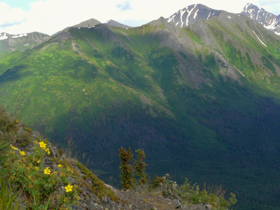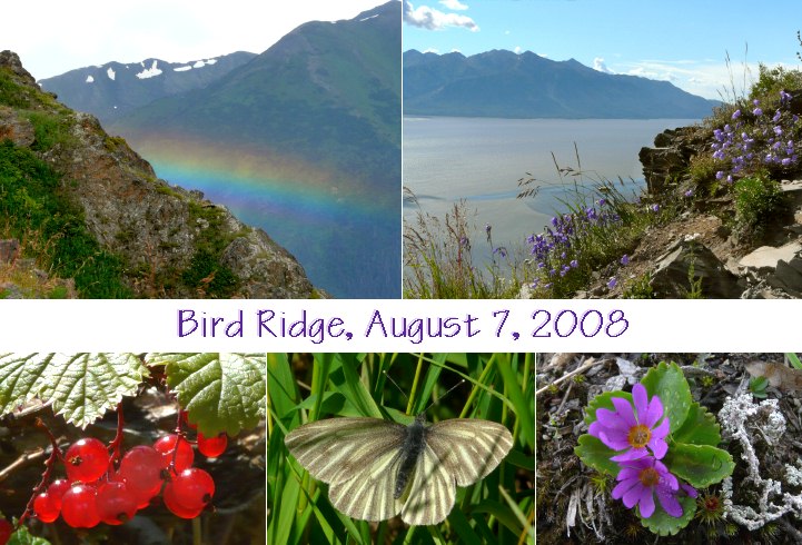 | 8/7/08 Conditions were absolutely beautiful, sunny but not too hot. With this nice break in the weather, I hoped to reach the pinnacle on Bird Ridge. So Jascha and I kept plugging along the very steep trail. When I saw a thunder storm develop over Anchorage, I hoped it wouldn't reach us about 20 miles to the south. Just as I reached the elevation where I had the pinnacle in sight, the wind sprung up, dark clouds move over us, and the rain began. You don't want to be on a high point in an electric storm, so we headed back down. Good thing, too, because both of us barely had the energy left to get back to the van. The dog and I were both stumbling on rubber legs. We were a fine old couple helping each other down the trail. :-) Click the photos in the collage for a better view of them, and also check out the list of photo links below. |
