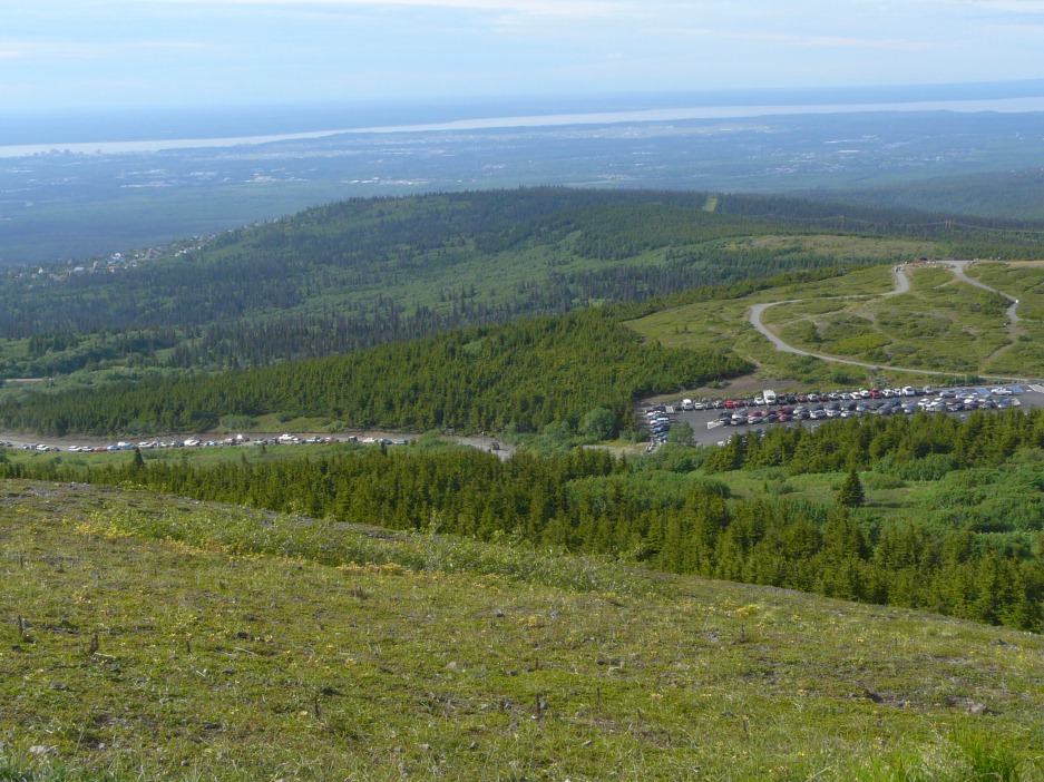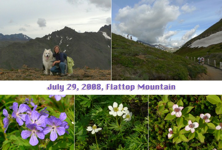 | 7/29/0 I've been back from my roadtrip since Saturday afternoon, and the weather has been gloomy. Most of the time, the mountains have been completely socked in, invisible from town. Today the fog lifted somewhat. Sometimes you could even see blue sky, as clouds moved through. Apparently, cold damp conditions have been the norm here while I was travelling across the continent. With the arrival of a decent day, Anchorage moved up to GlenAlps to climb Flattop Mountain. The parking lot was full and there was a long line of cars parked along the road. The crowds don't bother me; it's part of the Flattop experience. This is the first chance I've had to hike up the mountain this summer, so it was a great pleasure. Click the small pix to see larger versions, and check out the links below the collage too. | ||