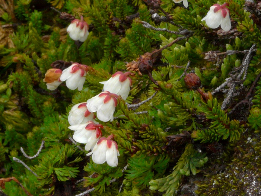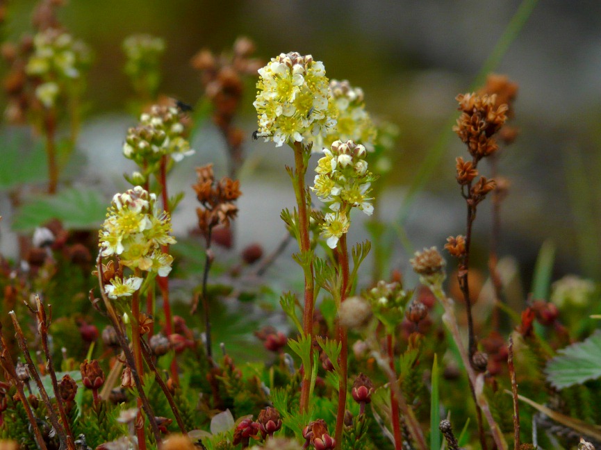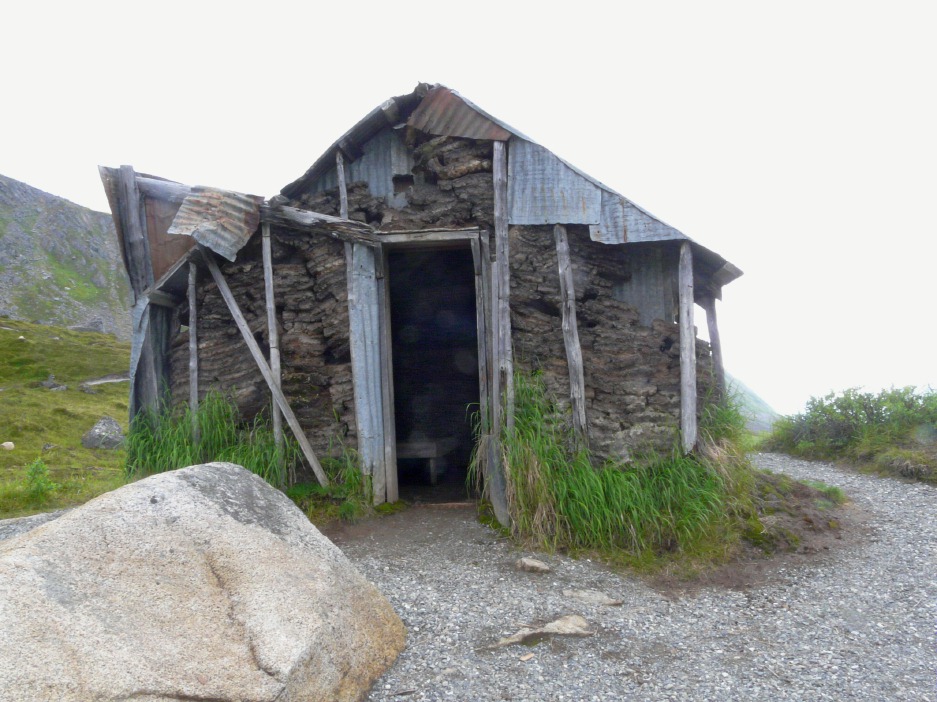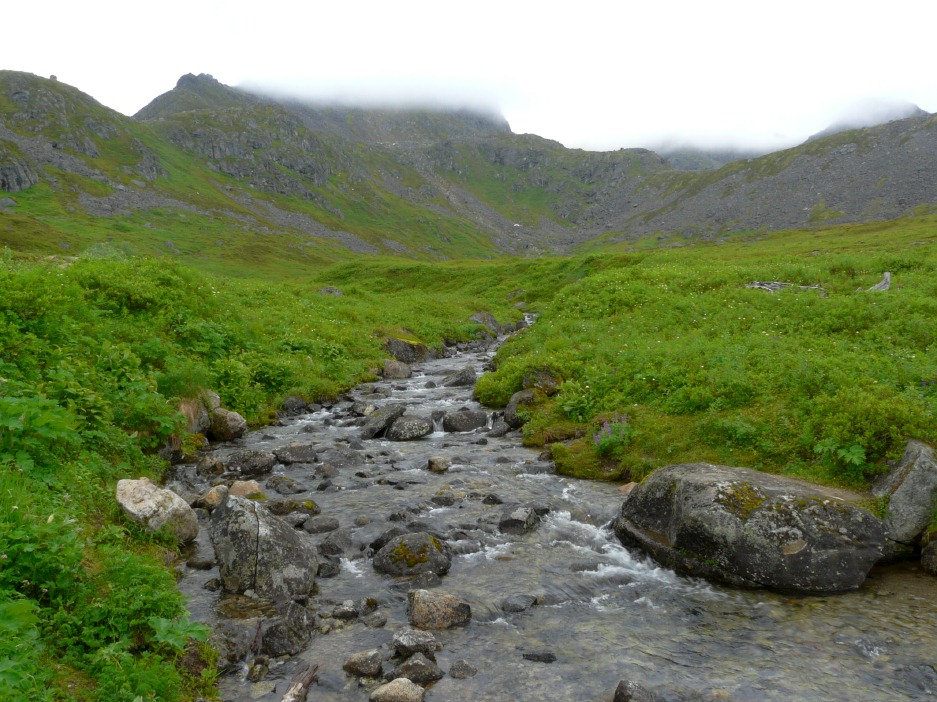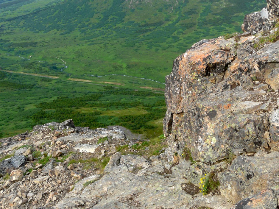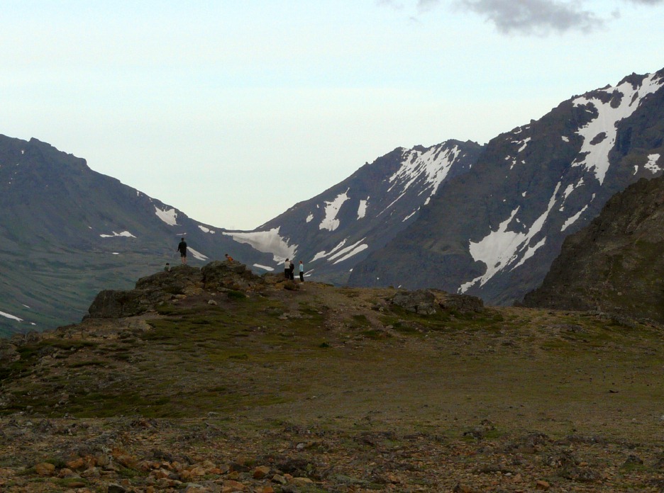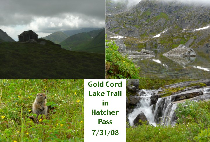 | 7/31 The weather was clearing in Anchorage, so I had high hopes for nearby Hatcher Pass. It's a gorgeous place for a hike, and although the clouds hung low in the mountain peaks, there was no significant rainfall while we were there. I haven't been on the Gold Cord Lake trail for a couple years, and it has been lengthened and repaired since then. Areas of erosion and damage to the tundra have been filled in. Sections that used to be very steep now have easily negotiated switchbacks so no scrambling is necessary. The scenery is as beautiful as always, and the slopes still resound with the "tsik-tsik" alarm from dozens-- hundreds?-- of arctic ground squirrels. The tundra is covered with flowers. |