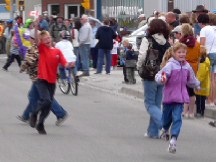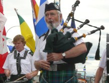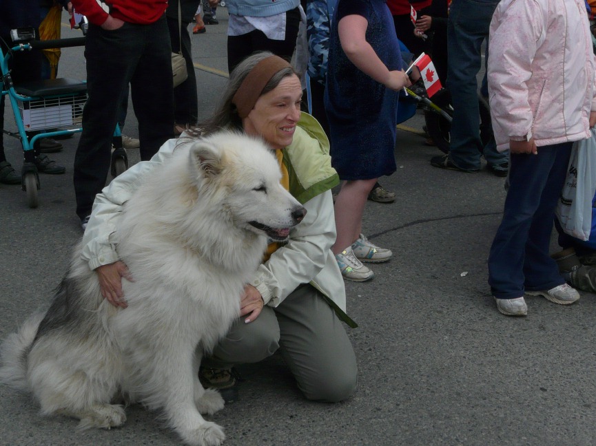 7/1/08 It's CANADA DAY! I don't know what that is exactly, but it's terrific fun. Just like 4th of July in the USA, with parades, barbecues, and activities in the town park. We caught the parade as it came up 2nd Avenue and turned into Shipyard Park. The wonderful bagpipers were the highlight for me; the single pony at the end was most thrilling for Jascha. It was all a joy to watch, participants and spectators. Everyone was having such a good time. Wind, rain, and clouds couldn't dampen the high spirits. | ||