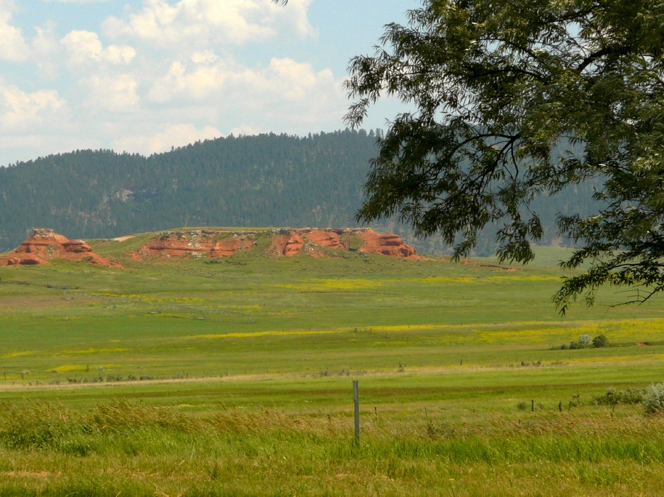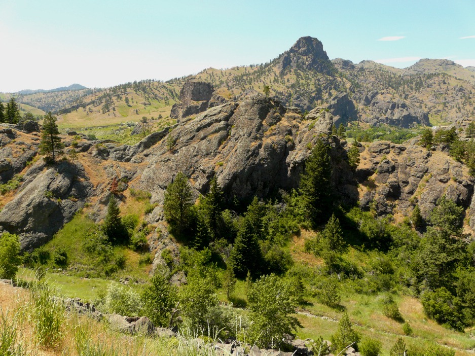 July 9 & 10 Crossed the border Wednesday morning into Montana, and drove 500 miles, almost all the way through that big state. Northern part was just like Alberta, but some more interesting features start cropping up around Helena. It was hot all day, reaching about 90ºF, but that's not a problem until we stop and get out. Cooled down nicely after the sun when down. I'm not used to losing the sun so early, as I drop further south. Thursday was another scorcher as I drove through Wyoming. It was a 3 state day, starting out in Montana, through Wyoming, and I'm camping tonight in Kadoka, S. Dakota. A little over 400. Jascha and Angel are coping well with the heat, drinking a lot and staying still and calm. | |