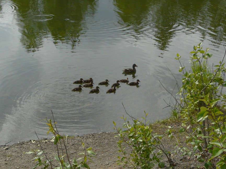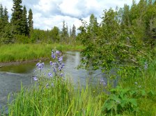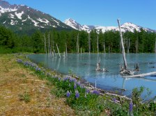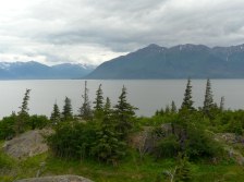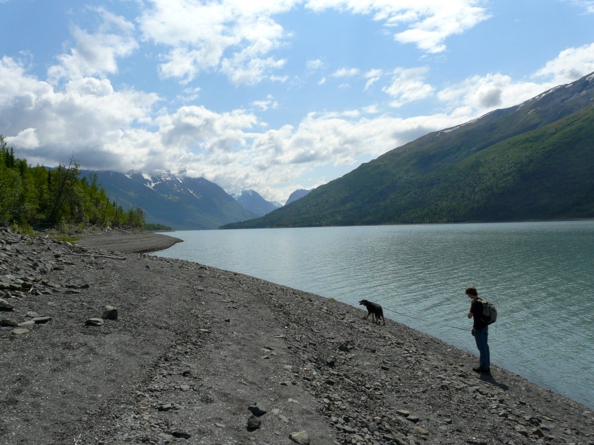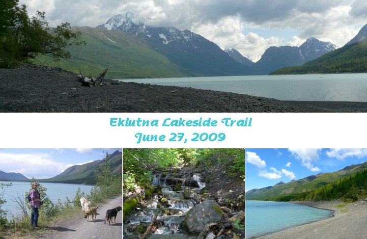 | 6/27/09 After quite a few unpleasant days, this one had potential, so a so a friend and I, her teenage son, and all three of our dogs took a nice stroll out the Elkutna Lakeside Trail. The trail goes out about 13 miles, but we just went to the first cabin at Yuditna Creek for a round-trip of seven miles. Clouds moved through and there was a light breeze but no rain. Shonti took the picture of me with Jascha and her two dogs, Kona and Maya. The other images are from my camera. Click any of them to see larger versions. And check the additional pix below the collage, too. |