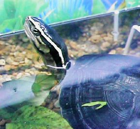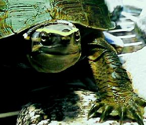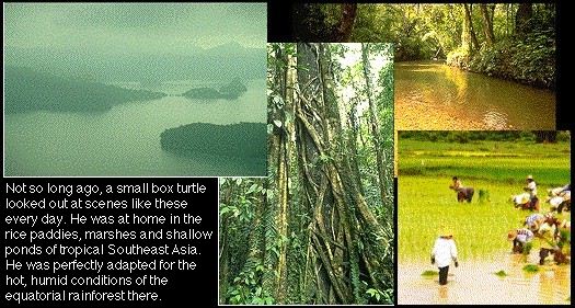 Then everything changed... . He lives with me now. It is my job to provide him with everything he needs to be content, so it became important for me to learn as much as I could about his natural environment, in order to care for the turtle correctly. It would be unkind of me to force highly unnatural, uncomfortable conditions upon an innocent critter. I first heard about aquatic box turtles in Southeast Asia from a co-worker who grew up in South Vietnam. He said he had often seen them swimming in the rice paddies. As a child, he had caught them for fun. At the time I didn't quite believe that they were box turtles, because I had the mistaken notion that all box turtles were primarily terrestrial, as is the case with our North American genus, Terrapene. (Box turtles have a hinged plastron which allows the animal to tuck inside the shell and close up tightly.) When I researched more information on the animal, I found that the "eye witness" was absolutely right--there is one species of box turtle that prefers a very warm, aquatic environment. Its name isCuora amboinensis, or Malayan box turtle. I found this unique creature to be so fascinating that I just had to have one in my personal collection. (There is one similarly aquatic box turtle in North America--Terrapene coahuila --which is an endangered species, not available in the pet trade.) | |||