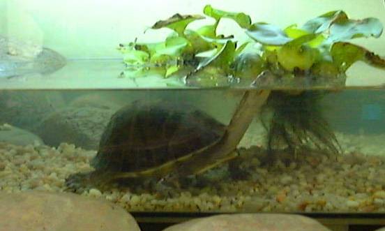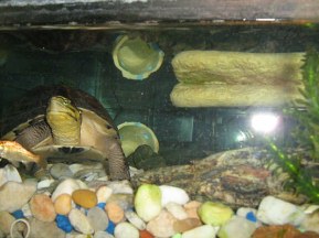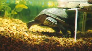 | Taiping often swims under his raised land area and rubs his carapace against the rack, wiggling his tail end back and forth, while pushing upward. He also spends considerable time exploring every inch of the bottom of his tank. | |||