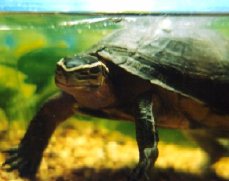 | Although some people report that their Malayan boxie is timid, mine is not particularly shy. He often seems to be watching the activities of the people and cats in our household. He peers through the aquarium glass while swimming or basking, smiling at all he surveys. (He shows a special fondness for one cat, Jasmine, who is equally curious in return.) Taiping does not dive into the water if we approach him, nor does he panic when handled. | |||