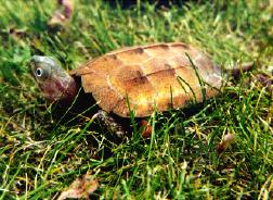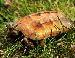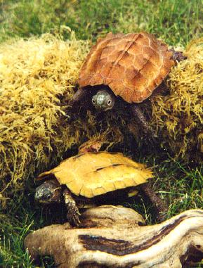 The black-breasted leaf turtle takes it's common name from the dark plastron, which is black in both of these specimens but can be very dark brown, gray or green. The male (right) has a much larger tail and a slightly concave plastron. |